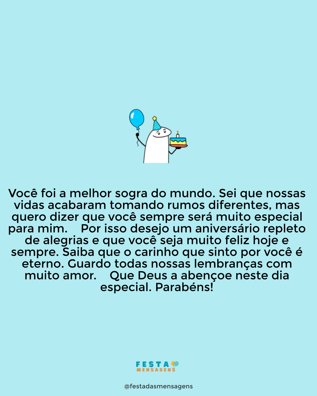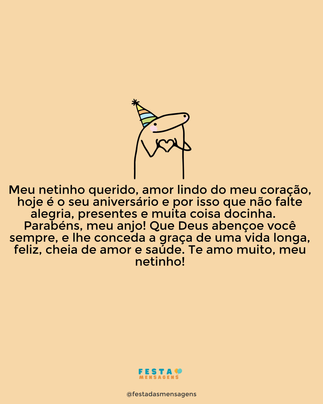 A você que é meu filho, eu desejo uma jornada de infinita alegria. Tenha um aniversário tão feliz e verdadeiro quanto é nosso relacionamento. E que continuemos demonstrando que não é o sangue que liga as pessoas, mas sim o amor. Tenha um dia lindo como é seu coração e divirta-se, porque nada mais importa neste mundo. Parabéns por mais um ano de conquistas, meu amor!