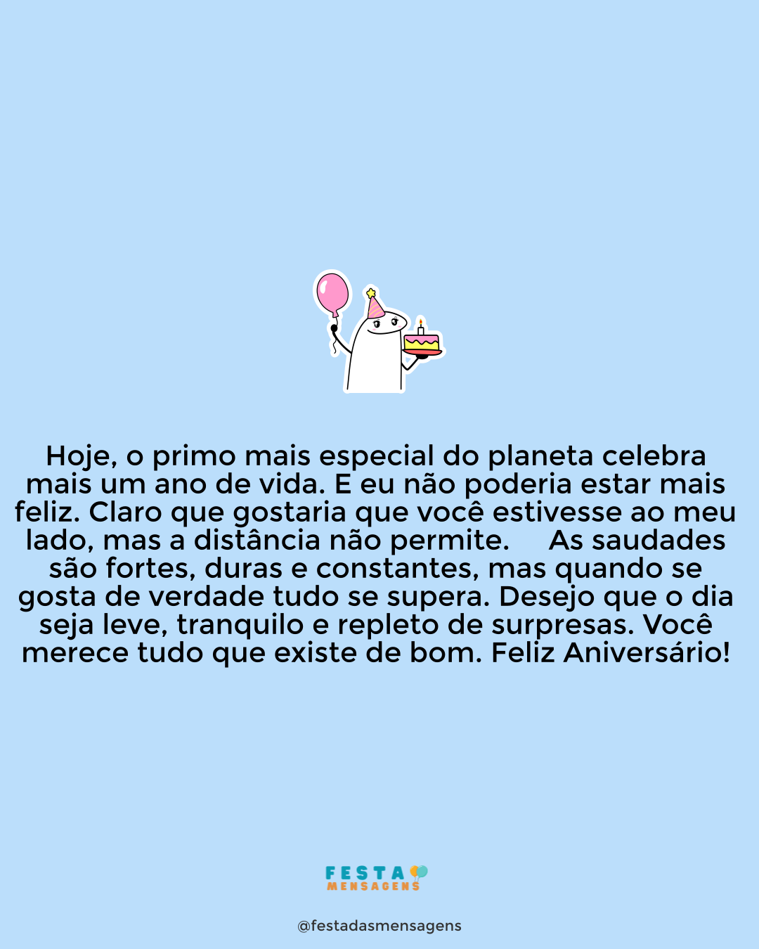 Você nem imagina como meu coração fica apertadinho quando chega o seu aniversário. Já são tantos anos longe uma da outra, mas não consigo me acostumar com a saudade. Você faz muita falta aqui ao meu lado, mas o seu espaço na minha vida continuará para sempre muito bem guardado. Que eu desejo sua total felicidade já não é nenhuma novidade; você sempre lutou tanto para chegar onde chegou que tenho certeza que todos os anjos também compartilham desse meu desejo. Que Deus permaneça para sempre ao seu lado, ajudando você em todas suas decisões e a superar qualquer dificuldade. Espero que essa distância possa o mais rápido possível ser encurtada, tenho imensas saudades do seu abraço e das noites regadas a muitas conversas e gargalhadas. Aproveite o seu dia com tudo que tem direito, pois datas importantes como esta não podem deixar de ser comemoradas! Feliz Aniversário, Amiga!
