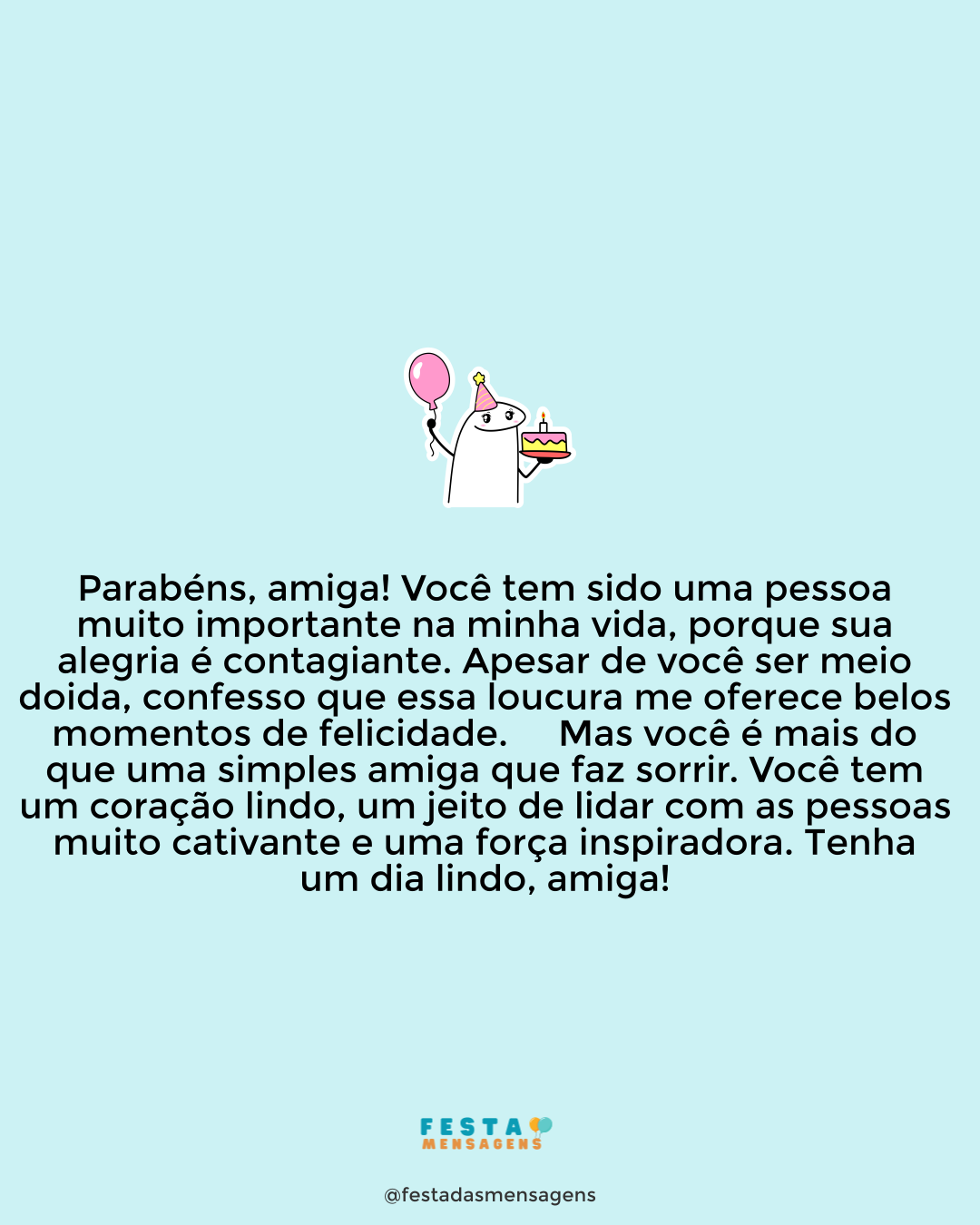 Minha amiga querida, imagino que esteja muito feliz em poder contar comigo neste dia especial. Afinal, não é todo mundo que aguenta você e que está aqui para lhe abraçar e desejar um feliz aniversário, não é? Aguentar você é um prazer, porque apesar de ser chata, é minha amiga. Por isso, venho desejar um dia repleto de alegria, felicidade e muita paz. Que encontre sempre mil razões para sorrir e que sempre tenha amigos e amigas para comemorar este dia. Amo muito você, amiga chata! Parabéns!