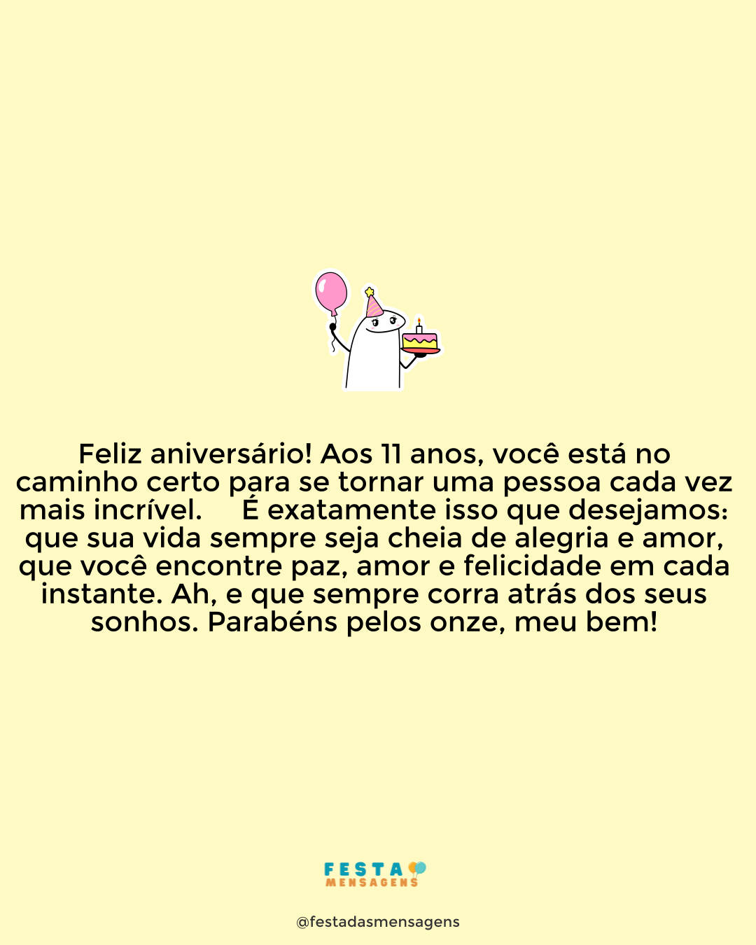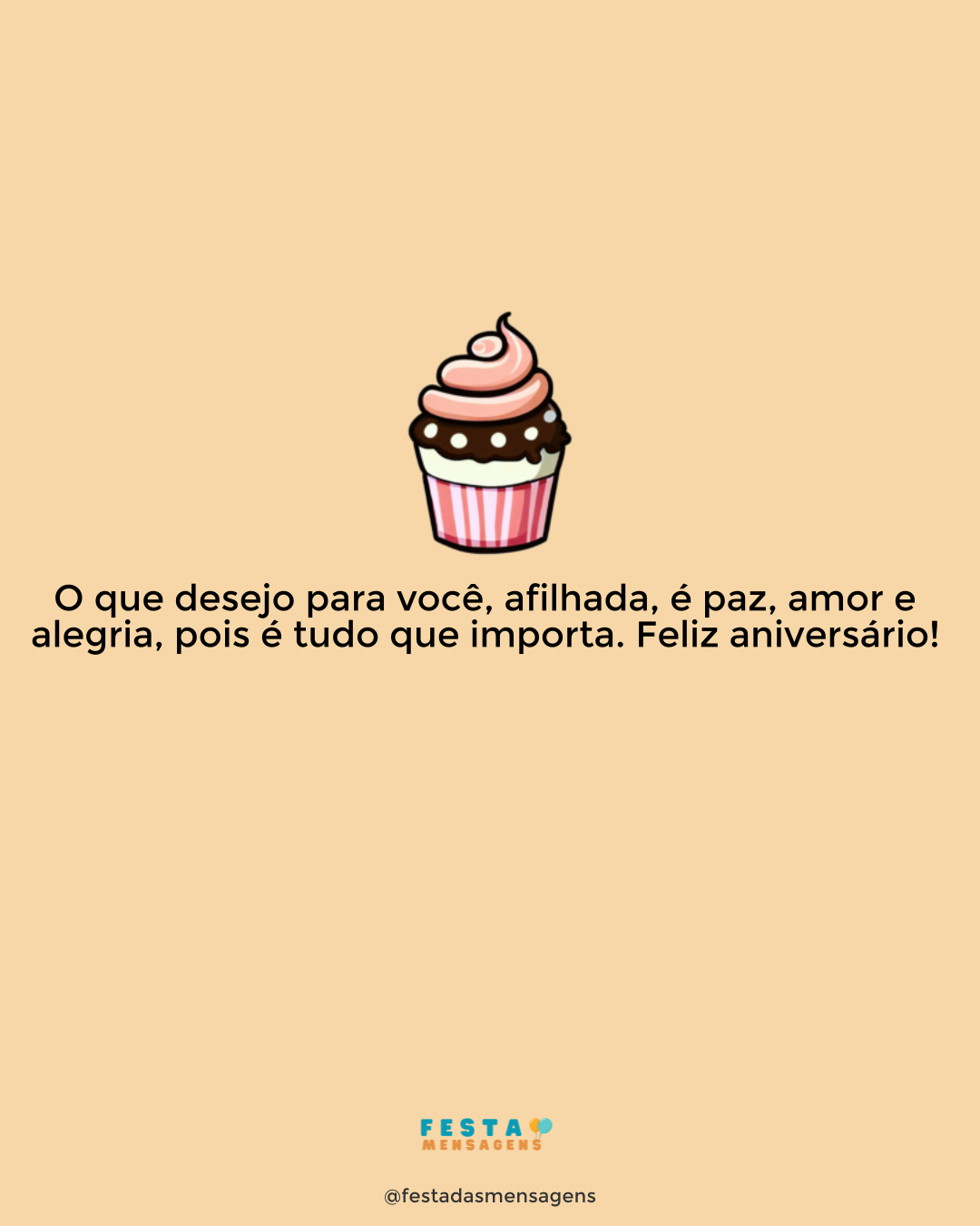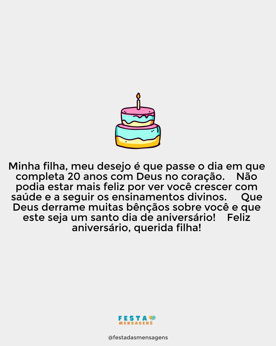 “Encheste o meu coração de alegria, alegria maior do que a daqueles que têm fartura de trigo e de vinho." Salmos 4:7 Parabéns por mais um aniversário! Acho que jamais irei conhecer alegria maior do que ver você em paz, feliz e de bem com a vida! Deus tem estado ao seu lado desde o começo e a Ele agradeço todas as proezas, milagres e apoio. Você nunca está só: o Senhor está olhando e cuidando da sua vida permanentemente. Acho que essa é a maior bênção que podemos pedir na vida. E é só isso que peço a Deus! Que acompanhe você para todo lado eternamente. Feliz aniversário!