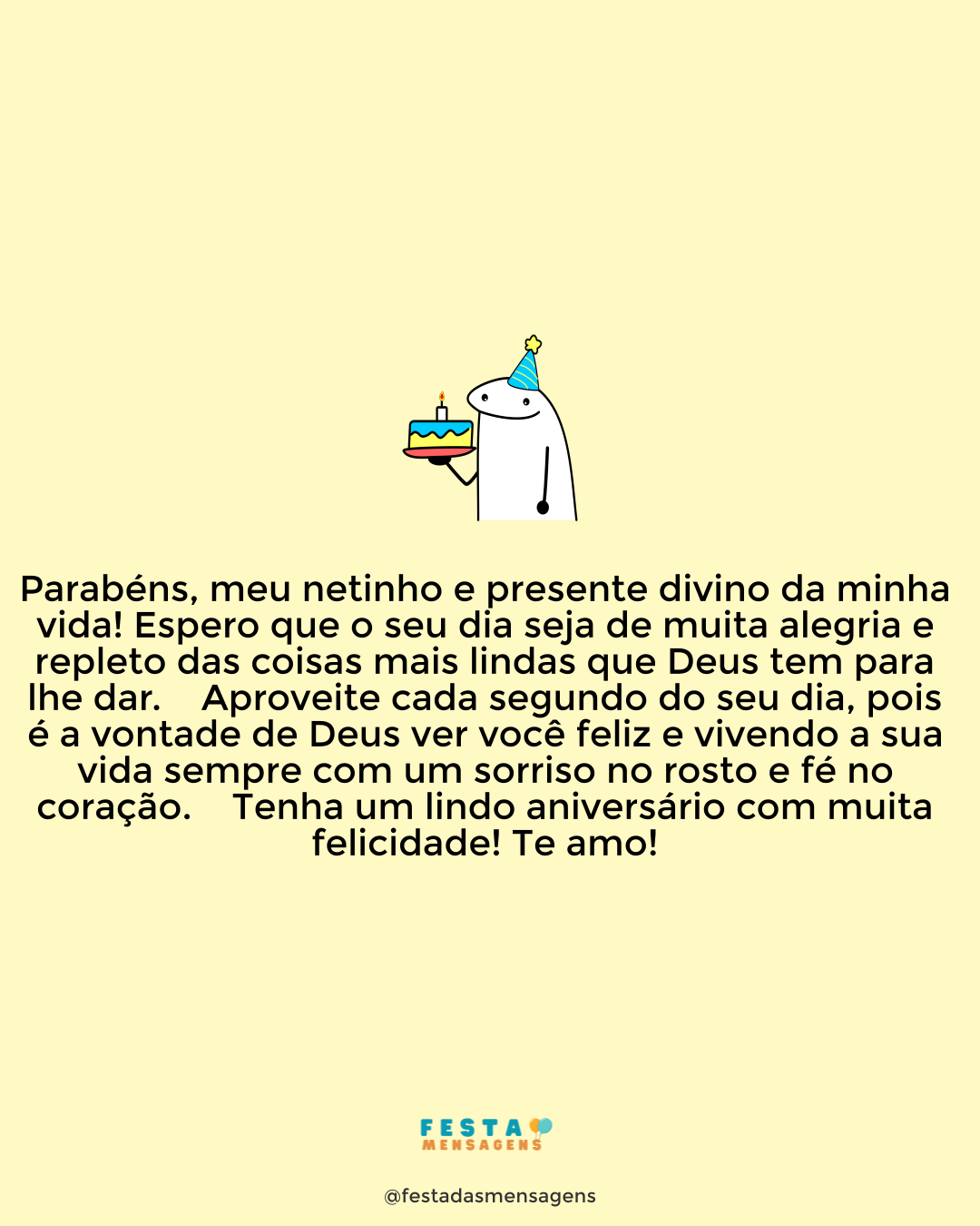 Meu amor tão pequenino, meu afilhado, minha vida, como eu o amo, como eu o sinto como um filho! Hoje você está de parabéns, meu querido, por completar três aninhos, três primaveras maravilhosas. Desejo que seu aniversário seja muito emocionante, com alegria sem fim e entusiasmante. Você é um doce, um menino muito fofo que merece muito todos os sorrisos que a vida tem lhe oferecido. Para mim é um orgulho, uma vaidade, ter um afilhado assim tão cativante e inspirador. Que no seu olhar more o brilho de sempre e o reflexo do seu coração de ouro. Divirta-se muito, hoje, amanhã e todos os dias da sua vida. Feliz aniversário, meu príncipe!