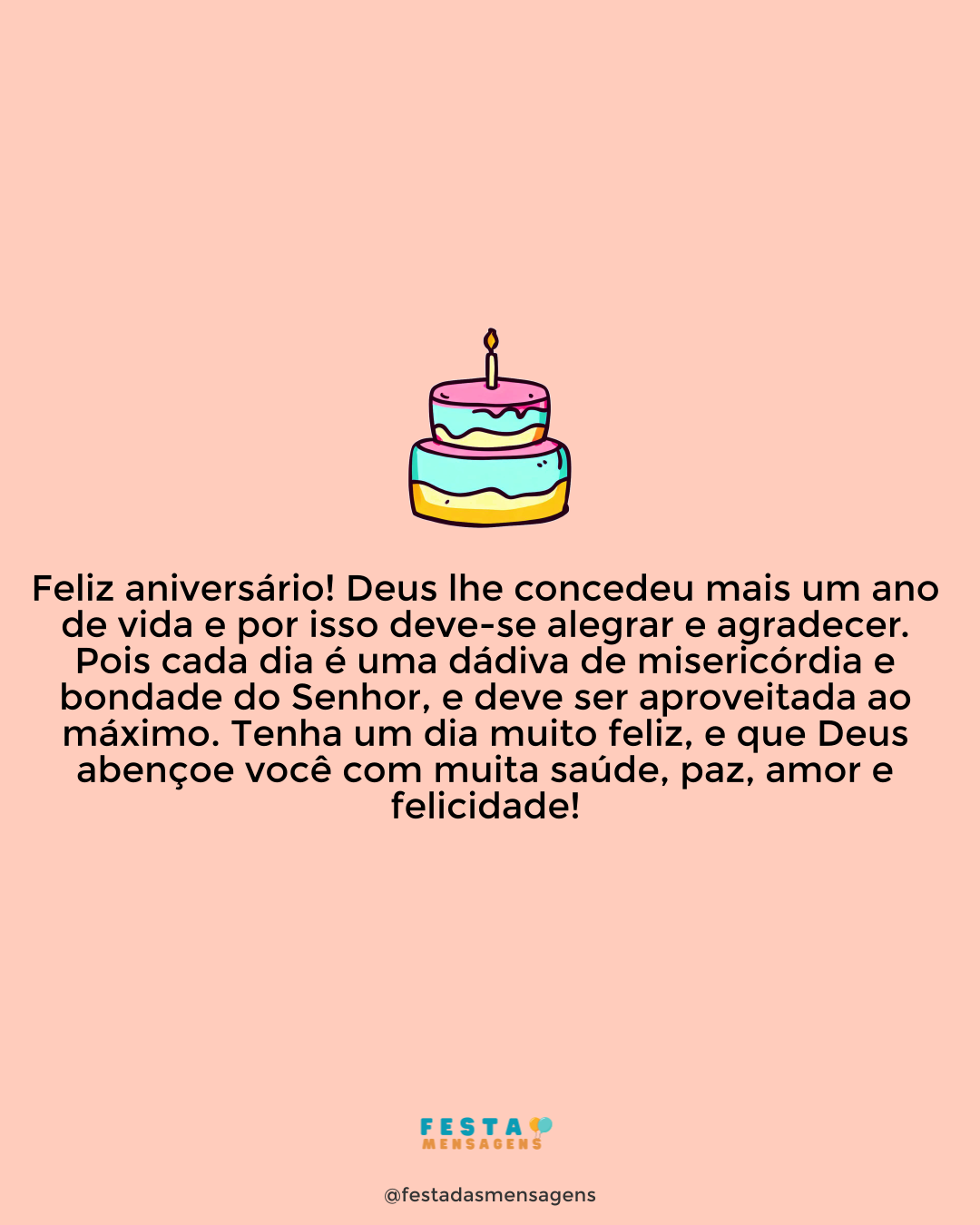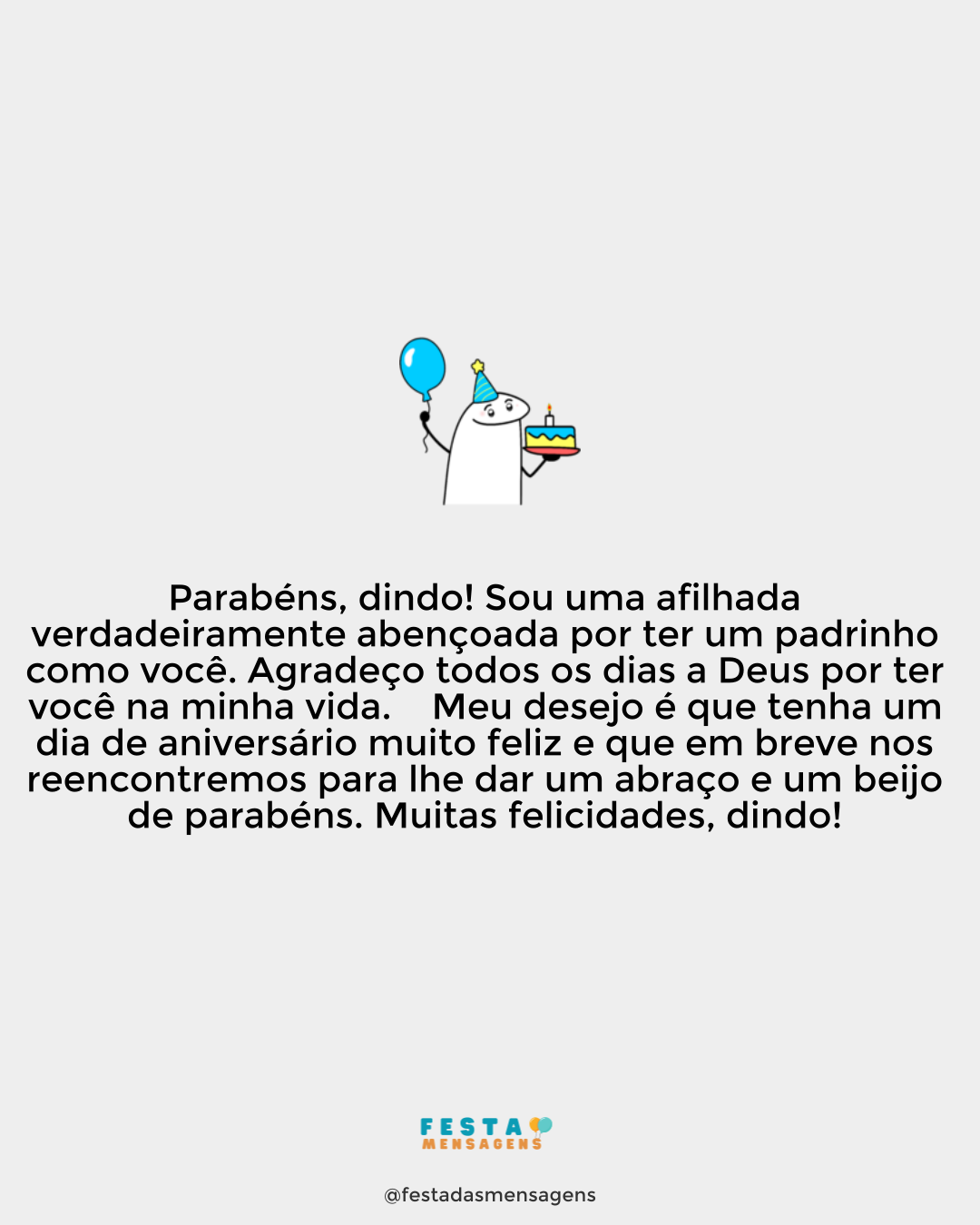 Parabéns, padrinho! Que seu dia seja abençoado com muita alegria e momentos tão especiais e únicos que se tornem inesquecíveis. Eu só tenho coisas boas que dizer de você, e acredito que assim também todos que conhecem você. Pois é uma pessoa maravilhosa, um exemplo de homem e para mim sempre foi o melhor padrinho. Você merece toda felicidade do mundo e que a saúde, o amor e a paz nunca abandonem sua vida. Feliz aniversário, padrinho!