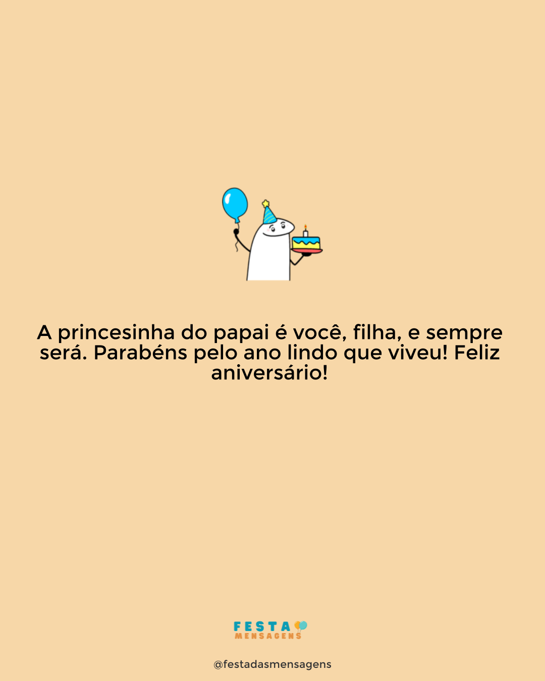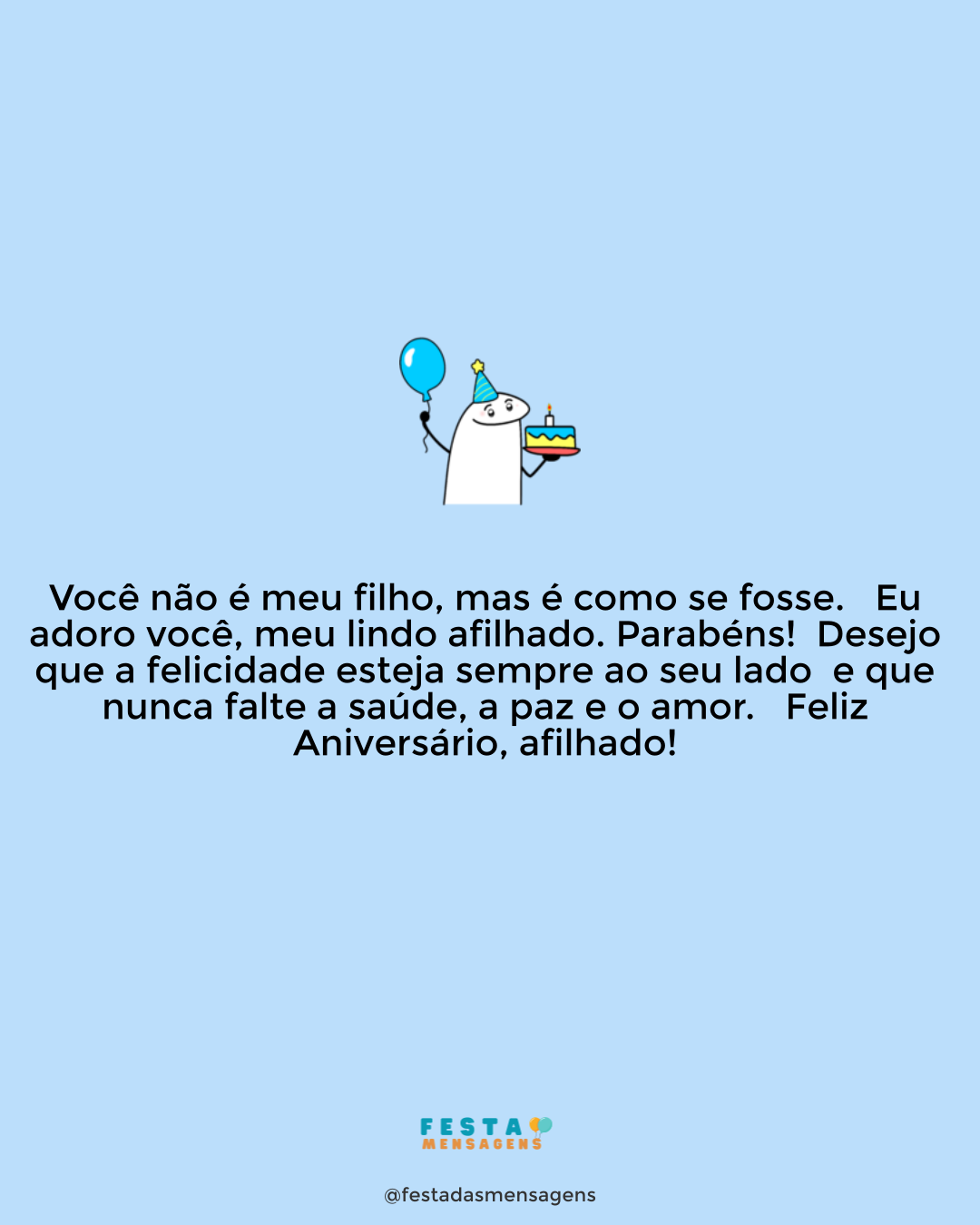Meu pai de consideração, meu pai de verdade, hoje você está de parabéns por mais um ano de vida e meu coração está rebentando de felicidade! Saiba que o amo profundamente e todos os dias torço pelo seu bem-estar. Podemos não ter nas veias o mesmo sangue, mas algo maior e mais importante nos une: o amor. Conte comigo para tudo, sempre. Ah, mas não se desvie do mais importante: o seu aniversário! Celebre ao lado de quem mais ama. Sopre suas velas e peça um desejo, coma seu bolo, cante, pule e dance! Hoje, o dia é todo seu e você tem o direito e merece fazer o que mais desejar. Parabéns, meu herói!