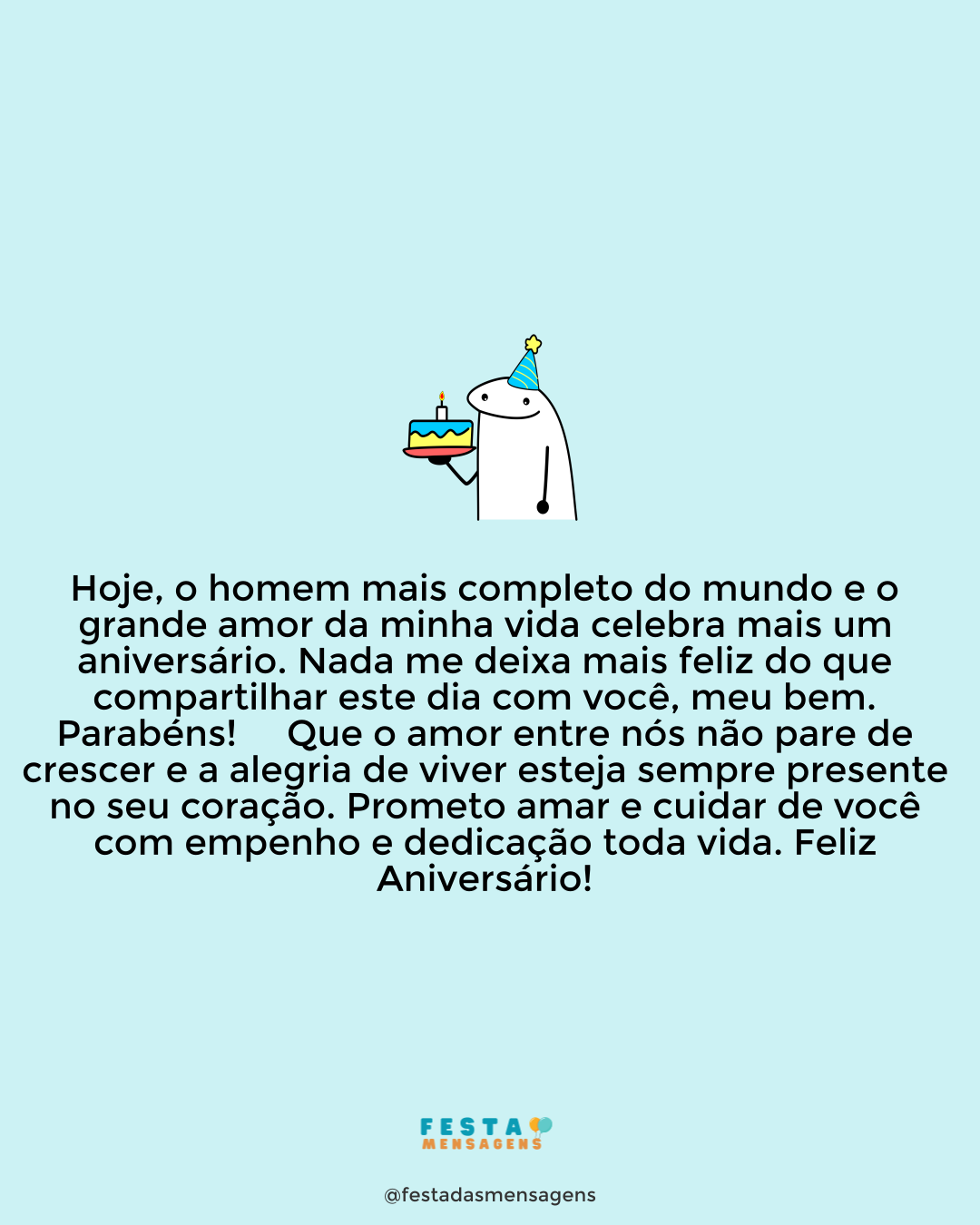A vida reserva surpresas maravilhosas. Conhecer você e juntos construirmos um relacionamento assim tão especial foi a maior de todas. E hoje estou especialmente feliz. Parabéns, amor por mais um ano de vida. Você é uma das pessoas mais lindas que conheço: tem um coração de ouro, um rosto de anjo e um jeito de enxergar a vida muito inspirador. Tenho muita sorte em compartilhar meus dias com você, meu bem! Tenha um dia memorável junto das pessoas mais importantes da sua vida, amor. Te amo!