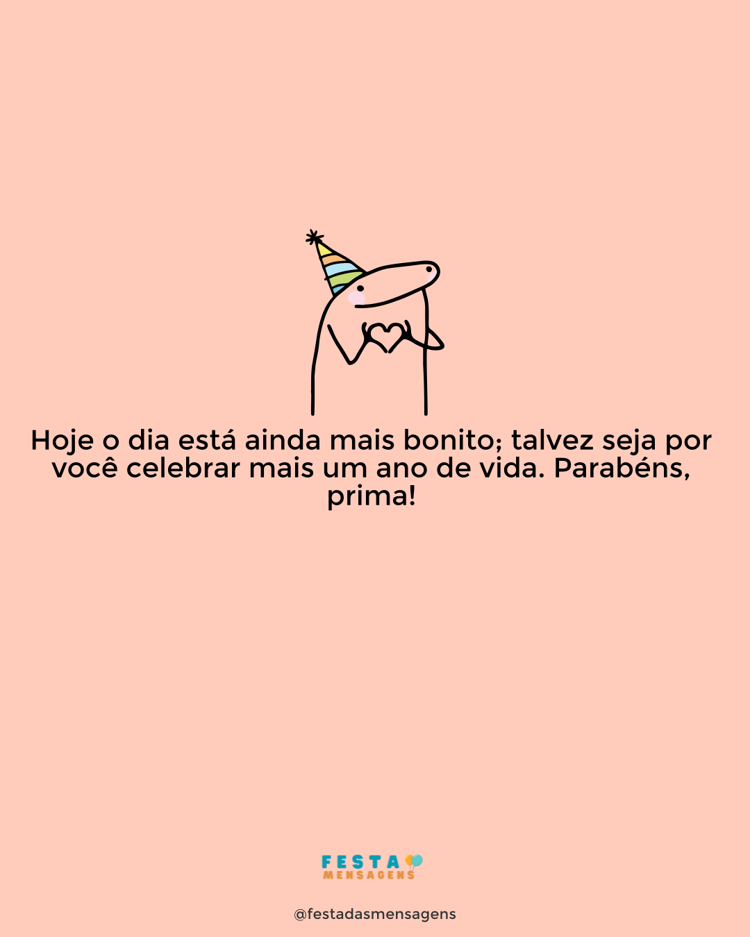 Parabéns, malinha! Hoje é o seu dia e não existe chatice no mundo que impeça a alegria de invadir nossos lares e corações com a comemoração de mais um ano de vida seu, prima! Quero ver você sorrindo muito e se divertindo como nunca neste dia. Você merece ser feliz, prima! Parabéns pelo seu dia!