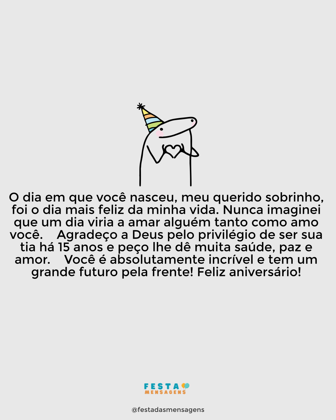 O bom de se fazer quinze anos é que se começa a ver o mundo de forma diferente de uma criança, mas ainda não se tem as preocupações dos adultos. Por isso, aproveite bem esta idade para ser aventureiro e explorar o mundo. Espero que tenha um dia de aniversário fantástico e peço a Deus que lhe traga felicidade e muita saúde! Parabéns, garoto!