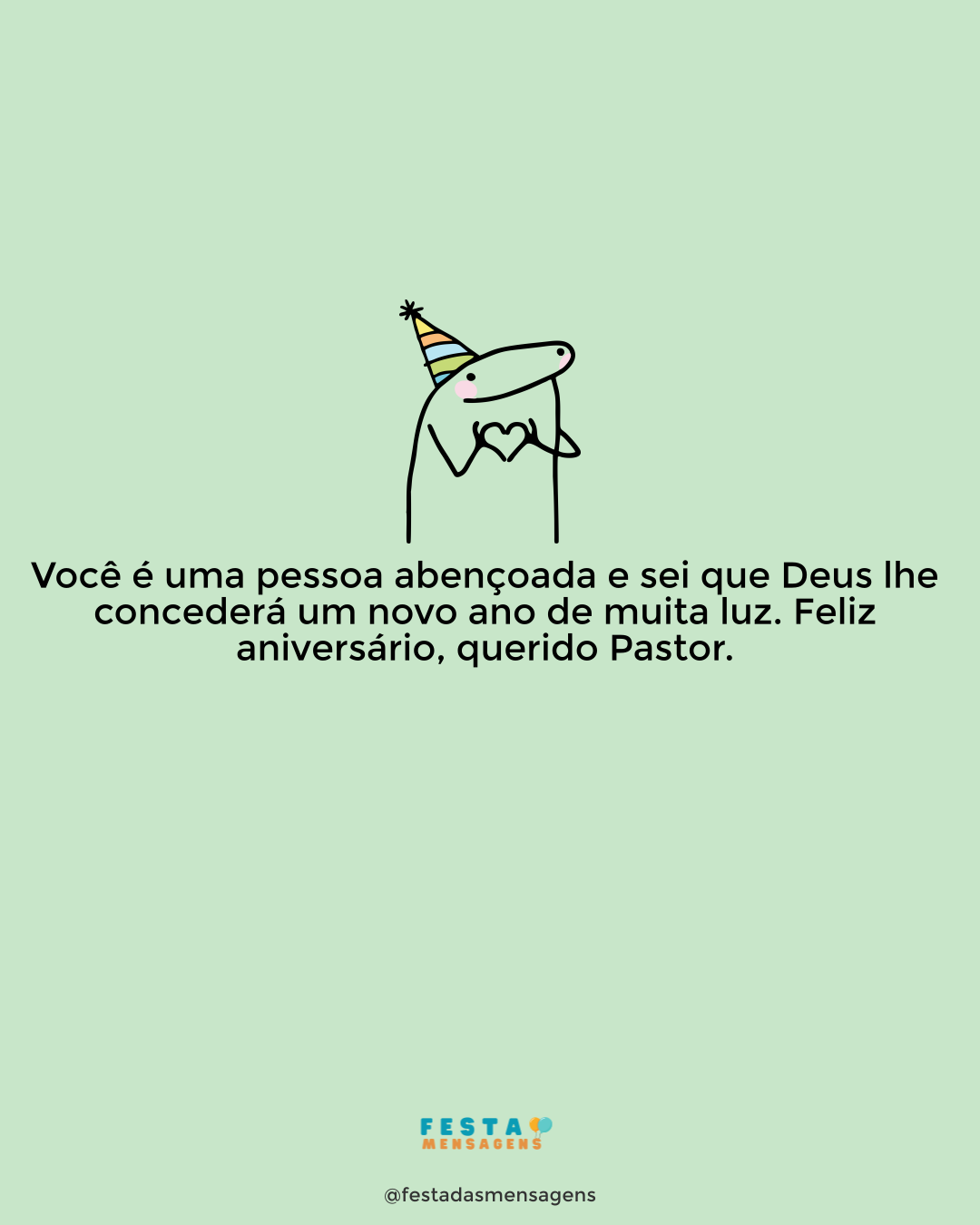 Estimado pastor, fico muito feliz em saber que hoje é aniversário da sua esposa e gostaria de desejar a ela toda a felicidade e que a graça de Deus continue fazendo parte dos seus dias. Sei que ela é uma mulher de sorte por ter ao seu lado uma pessoa como o senhor, mas desejo que ela tenha também um dia muito bonito, rodeada da família, amigos e todas as pessoas que a amam e lhe querem bem. Um feliz aniversário para sua esposa, pastor. Que Deus abençoe a sua família.