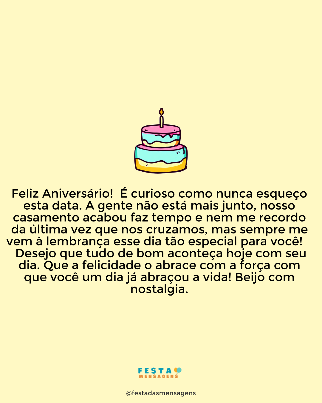 Apesar de tudo o que se passou entre nós, ainda sinto muito carinho por você, por isso, juntos ou não, vou torcer sempre por você. Hoje, que é o seu dia de aniversário, desejo muita sorte na vida, muita paz e muito amor. Espero que todos os seus sonhos se realizem e que um dia consiga encontrar a felicidade! Parabéns!