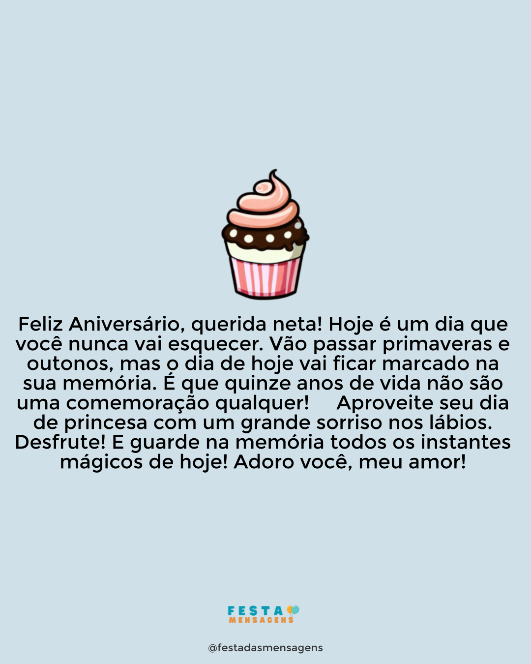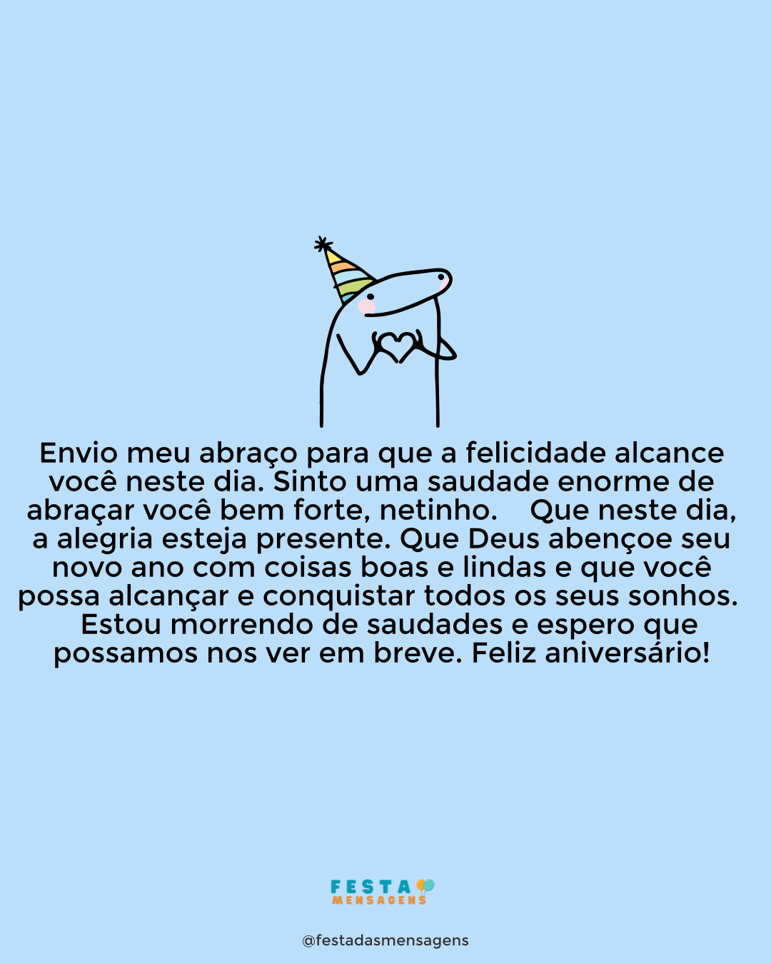 Hoje você completa 13 anos e alguns vão dizer que este é o número do azar, mas espero que saiba que isso é uma bobagem. Esta é uma idade abençoada. Espero que hoje, no seu aniversário, você possa descobrir a delícia que é ter 13 anos. Você está crescendo depressa, mas peço que nunca perca esta sua inocência que é tão bonita de se ver. Você é uma criança muito especial e merece um aniversário repleto de alegrias! Parabéns!