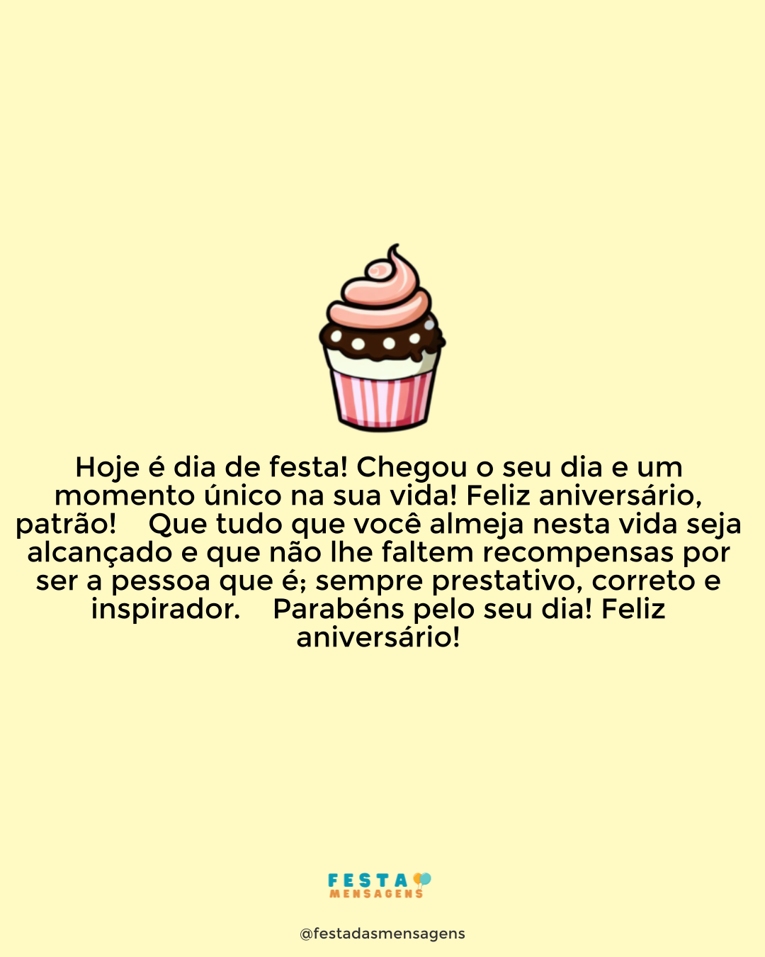 Porque hoje é seu aniversário, não vamos nos comportar como subordinados irritantes. Só hoje! Queremos celebrar um dia despreocupado, sem estresse e cheio de alegria. Seu aniversário deveria ser um feriado nacional, querido chefe. Pelo menos assim você não teria que nos aturar. Faça um desejo e siga-o onde quer que ele o leve. Feliz Aniversário para o melhor patrão do mundo inteiro! Tenha um ótimo dia e um grande ano pela frente!