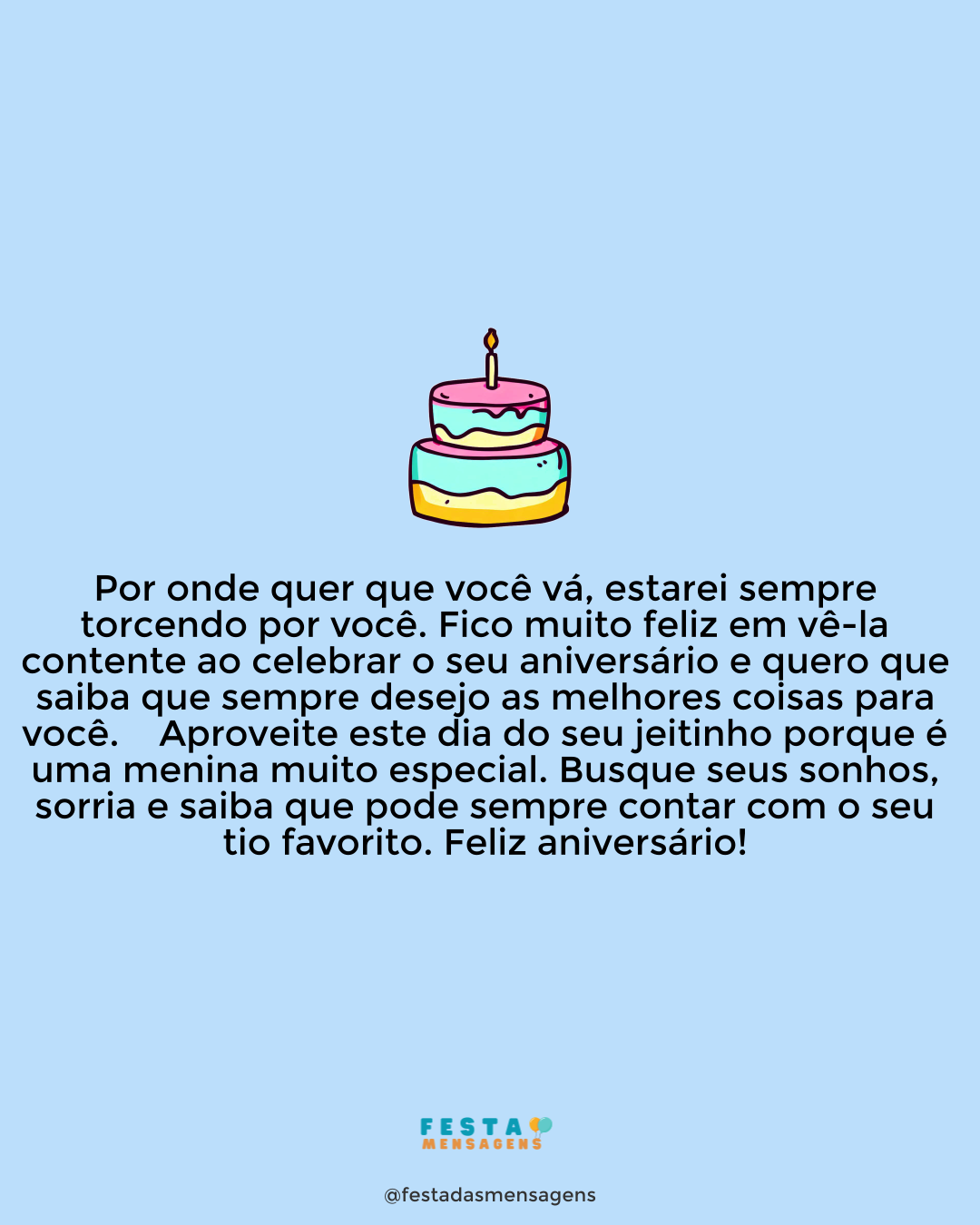 Parabéns por mais um ano repleto de momentos incríveis, de vitórias e provações sem fim. Só gostaria de estar mais perto, que você estivesse aqui para celebrarmos esta data frente a frente! Não vejo a hora de você regressar para imortalizarmos o momento do nosso reencontro. Sim, porque vai ser algo bem emocionante. Você é uma pessoa especial e eu estou morrendo de saudade! Aproveite seu dia com um grande sorriso no rosto e lembre-se que mesmo distante eu estou aí ao seu lado. Divirta-se e curta cada segundinho com alegria e muita felicidade!
