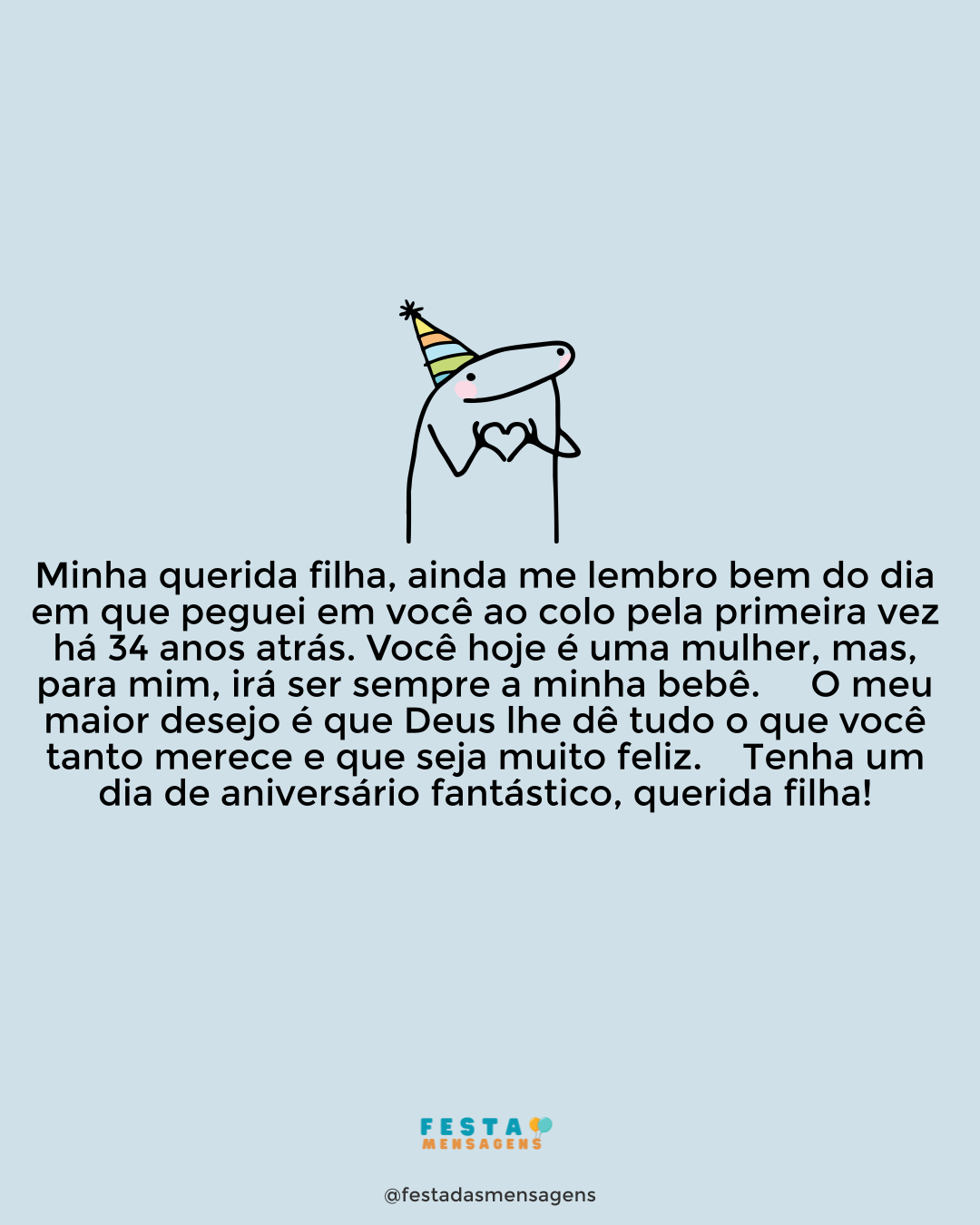 Filha, você sabe que nunca fui bom com as palavras e que o meu jeito de demonstrar afeto está nos meus gestos, no meu cuidado e, às vezes, até na minha preocupação exagerada. Mas hoje é um dia especial na sua vida e senti que precisava dizer algumas palavras, ainda que poucas. Eu sempre tive uma preocupação na vida: fazer você se sentir uma pessoa segura e amada. Sempre me dediquei para que você fosse uma pessoa que tivesse confiança em si mesma, que acreditasse nas suas capacidades, e que fosse uma pessoa forte para enfrentar os desafios da vida. E sempre fiz isso com amor, ainda que algumas vezes não parecesse. Mas em alguns momentos da vida, precisamos ser rígidos… Filha querida, todo esse blá blá blá é para assumir para mim mesmo que a minha garotinha cresceu. E hoje o que posso dizer é que tenho muito orgulho de você. Tenho orgulho da pessoa que você se tornou, e sou muito otimista em relação à sua vida. Acho que fizemos um bom trabalho! Sou um pai feliz e espero que você também seja feliz e satisfeita com a pessoa que é. Eu te amo muito e desejo toda a felicidade do mundo para você. Parabéns!