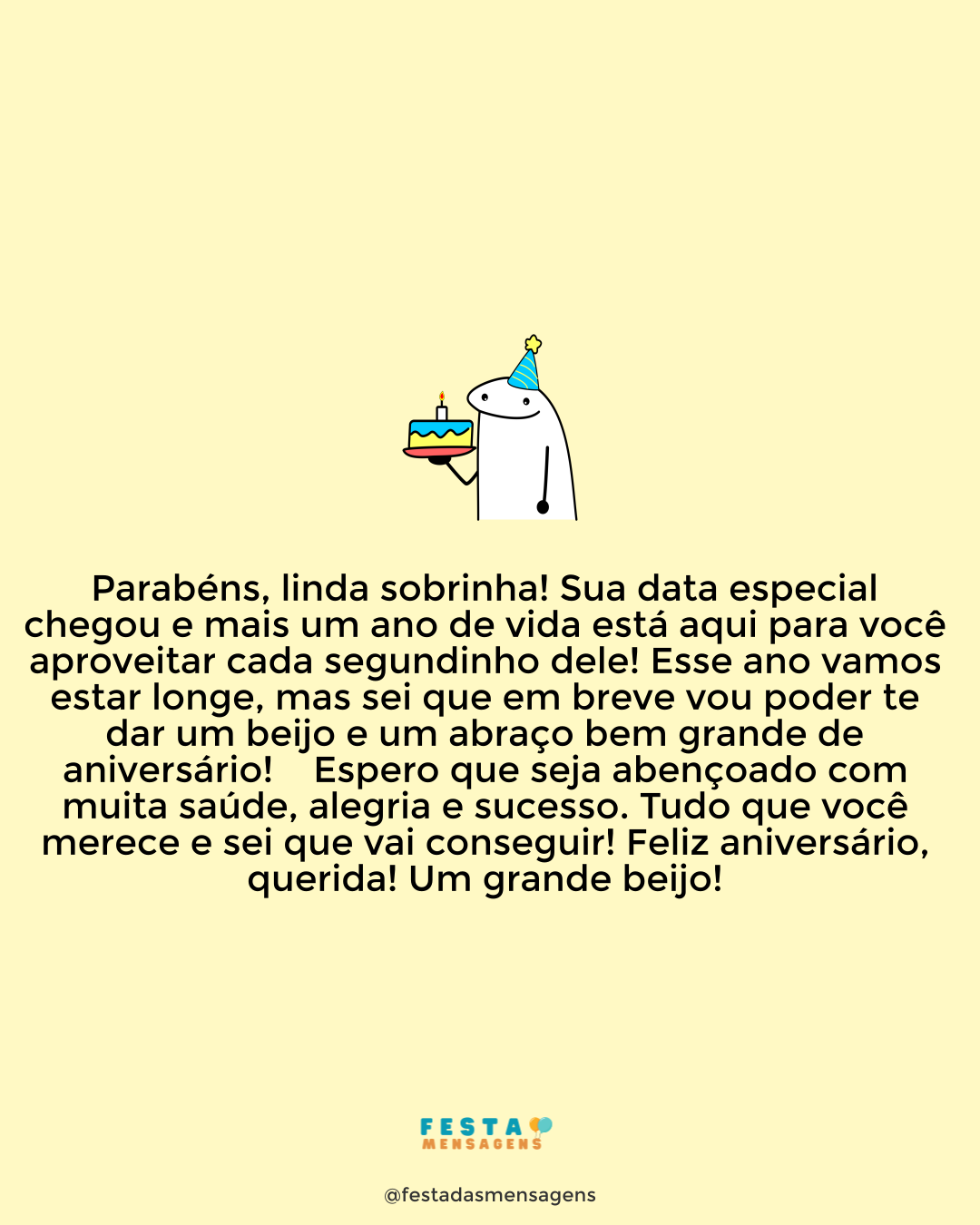 Você é a tia que todo mundo gostaria de ter na vida. E é também a madrinha mais incrível que poderia desejar. E que hoje fica um pouco mais velha. Brincadeira! Tenha um aniversário lindo, dinda! Que seus sonhos se realizem ainda hoje se possível! Que nada de bom lhe falte e que todos os presentes sejam abertos com emoção e entusiasmo. Transforme este dia em algo imensamente feliz e marcante. Parabéns por mais um ano de vida!