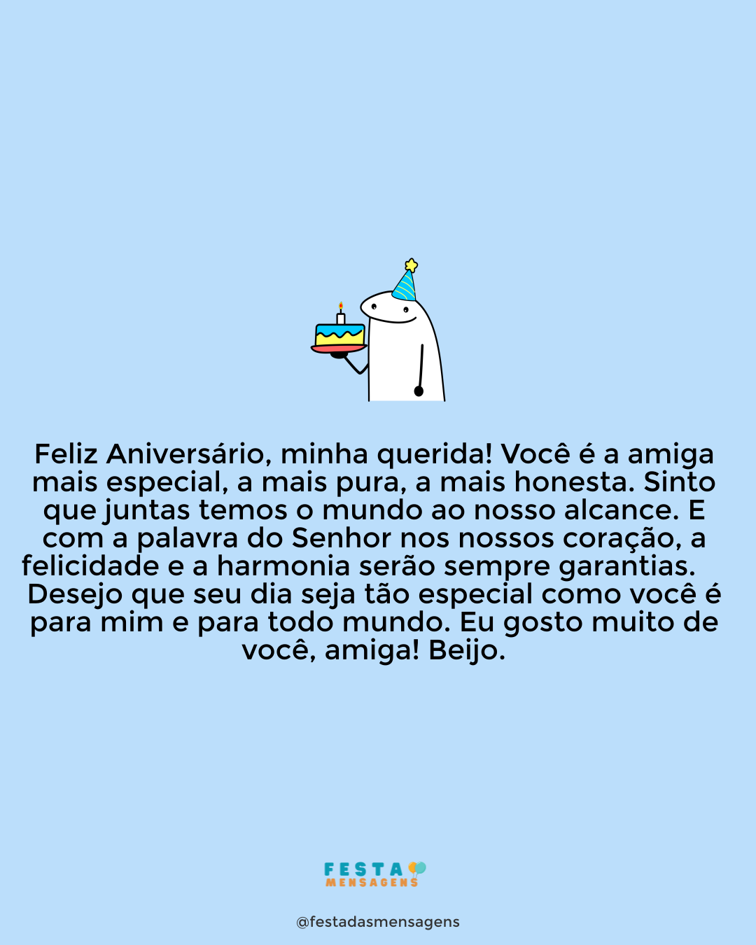 A minha filha de coração, que só tornou na pessoa que mais amo neste mundo, está de parabéns por mais um ano cheio de histórias lindas para recordar! Feliz aniversário, meu bem! Estou aqui torcendo para que esta data fique para sempre marcada na sua memória e para que todos seus sonhos se realizem ainda hoje. Sim, parece utopia, mas desejo sempre o melhor para você! Divirta-se e mantenha-se em paz, sorrindo e feliz, do jeito que merece. Tenha um aniversário muito especial, filha!