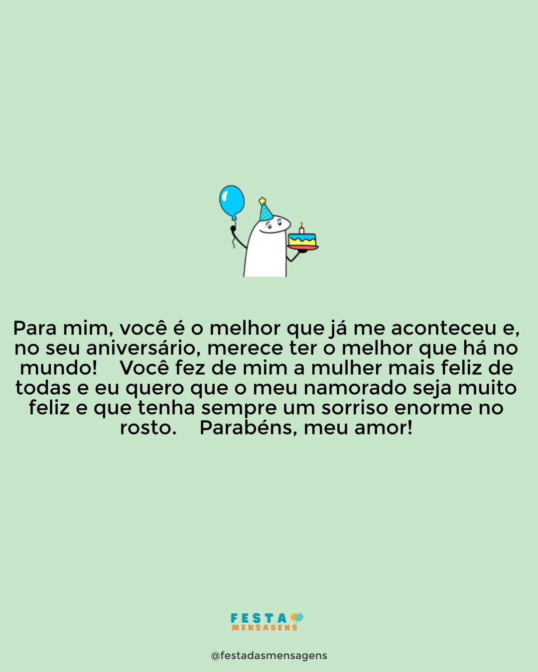 Hoje é seu aniversário e se pudesse lhe daria o mar, o céu e as estrelas, mas como não é possível, vou lhe cobrir de amor e carinho enquanto tiver forças para isso. Meu amor, você é a mulher da minha vida, a namorada com quem eu sempre sonhei e a razão de todos os meus sorrisos. Parabéns pelo seu dia, meu anjo! Que todos os seus sonhos se tornem realidade e que a vida continue sendo gentil com você e traga as conquistas que você tanto merece. Amo você.