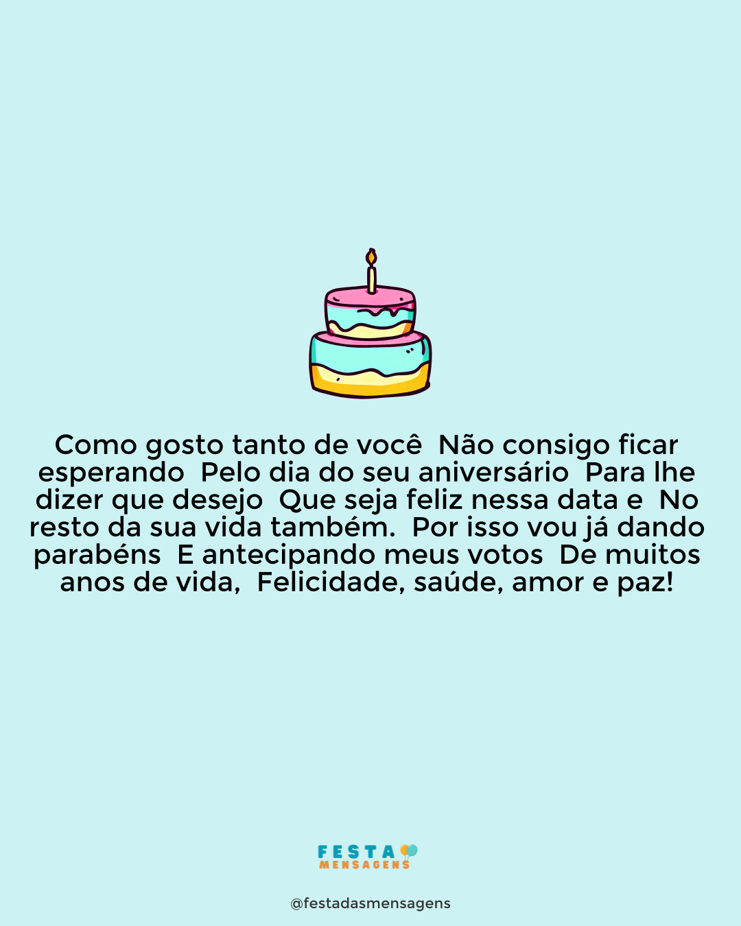 Feliz Aniversário! Desejo que seu dia seja todo alegria e no seu coração não falte paz e amor.