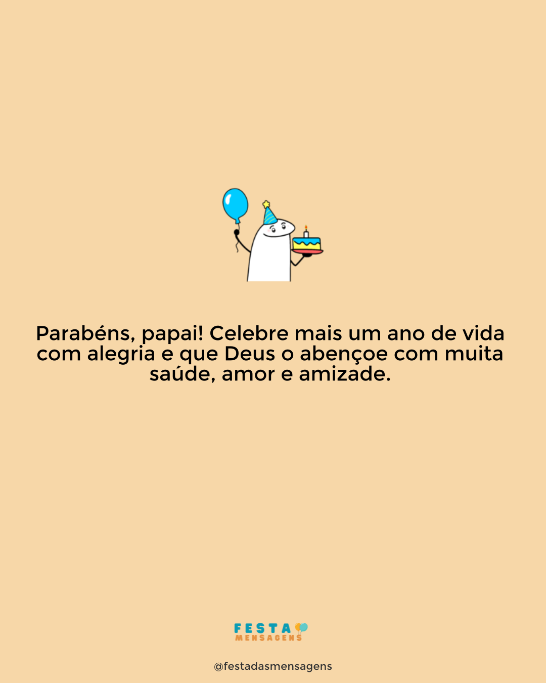 Papai, hoje é o seu aniversário e eu não posso lhe dar um beijo e um abraço muito apertado porque você está longe. Eu fico muito triste por isso, mas ainda bem que eu posso guardar o beijo e o abraço para lhe dar assim que você chegar, e eu sei que não vai demorar! Papai, eu o amo muito, você é o melhor pai do mundo, e eu sou muito feliz por ser sua filha! Eu desejo a você muita saúde, paz, felicidades, e que você possa passar muitos outros aniversários seus, aqui pertinho de mim e da nossa família. Parabéns, papai! Eu te amo muito!