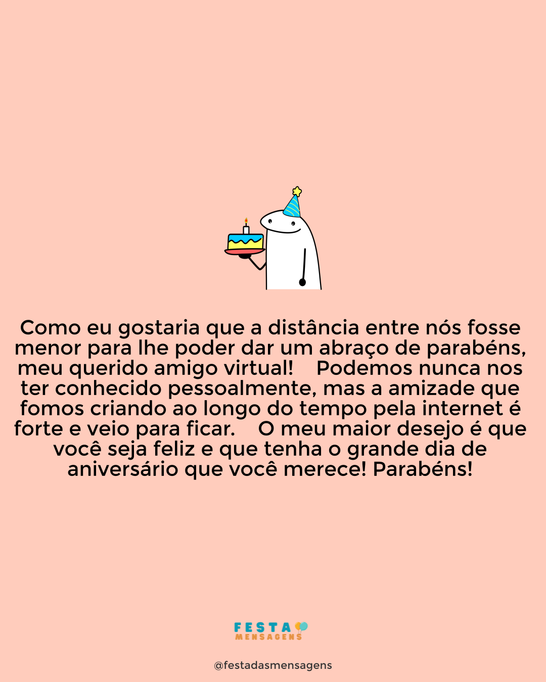 A fé nos uniu e é por isso que nada nos separa. Parabéns para você. Que Deus lhe dê sempre forças para seguir em frente e exercer a sua crença. Você sabe bem que tenho um enorme respeito e admiração por você. É muito bom ter alguém com quem eu posso compartilhar a minha fé e fazer a minha crença ainda maior. Este foi um encontro de almas e é por isso que desejo a maior felicidade do mundo no dia do seu aniversário. Parabéns e que Deus lhe abençoe!