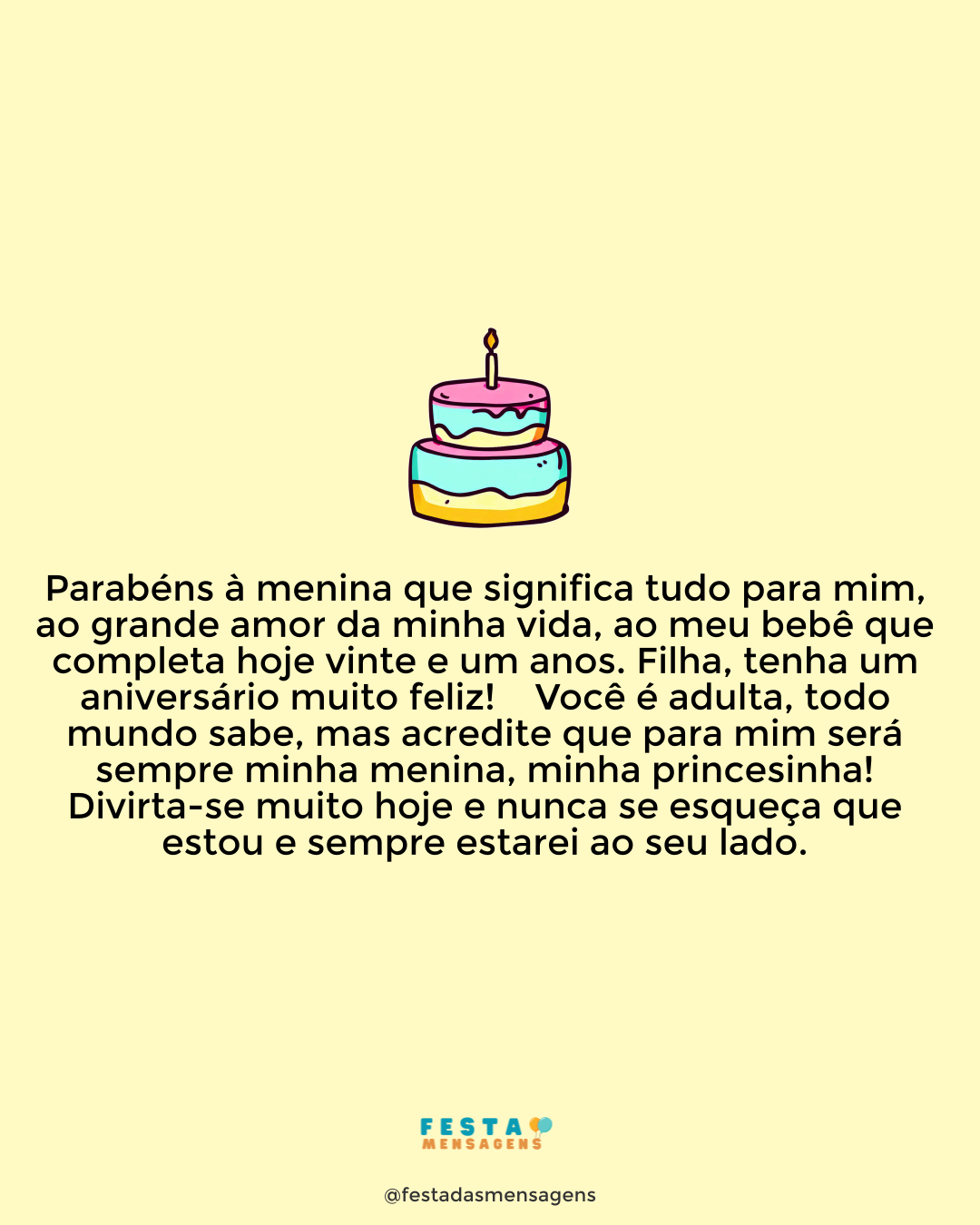 Hoje é seu aniversário Dia especial Doze meses lentos que foram Mas que passaram afinal Para os jovens cheios de esperança Esse dia custa chegar Para quem tem mais de trinta janeiros Não vêem os anos passarem Lhe desejo felicidade Não importa a idade que tem, Que esta data se repita muitos anos Parabéns, parabéns, parabéns! Feliz Aniversário, mãe!