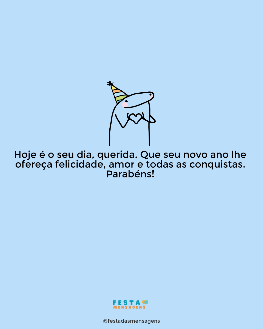 Feliz aniversário, meu grande amor! Alegre-se e agradeça por mais um Ano de vida, e peça muitos desejos Para o próximo que agora começa. Eu vou desejar que todos se tornem Realidade, e que você seja feliz em Todos os momentos da sua vida. Curta muito seu dia! Te amo.