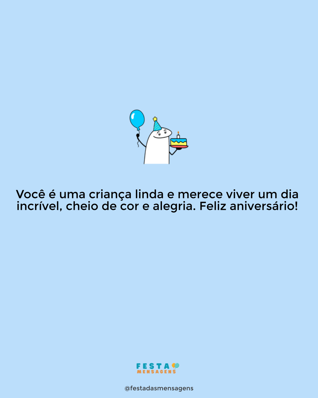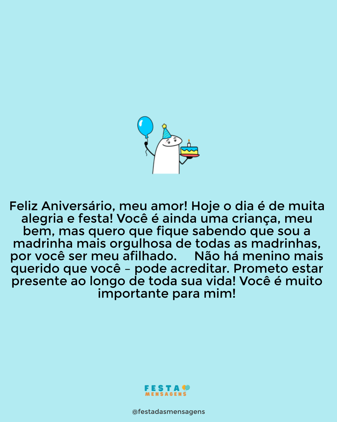 Meu amor, seu dia finalmente chegou: é seu oitavo aniversário! Espero que esteja muito feliz e se senta entusiasmado, porque este vai ser um dia para aproveitar em grande estilo! Eu não sei se alguma vez lhe contei, mas para mim você é uma das pessoas mais importantes que conheço. Amar e cuidar de você é algo simplesmente divino que eu faço de coração! Divirta-se até não aguentar mais. Faça exatamente o que quer fazer e não dê nem mais um passo que não queira dar. Ah, mas agora aproveite junto de todos seus amiguinhos e familiares, claro! Parabéns, querido!