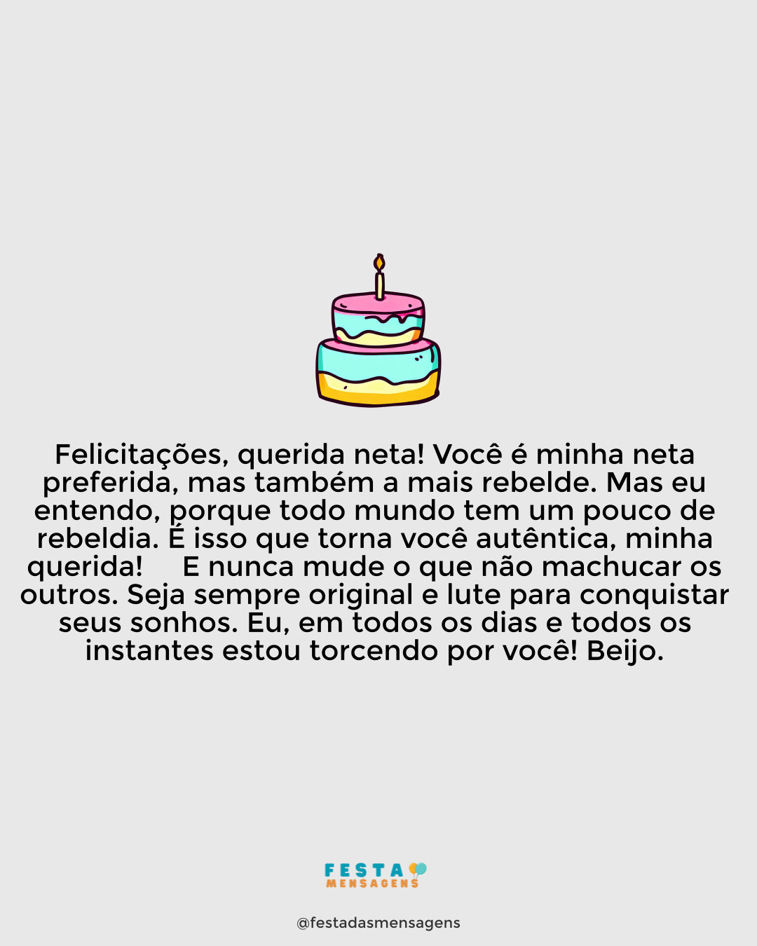 Parabéns, querida enteada! Aliás, me desculpe: Parabéns, querida amiga! Tenha um Feliz Aniversário! É que a origem de nossa união, dessa cumplicidade que nos une é a amizade, a amizade sem limite e sempre verdadeira. Aproveito para agradecer todas as coisas lindas que você me proporcionou, todas as cores claras que pintou em meus dias escuros. Obrigada por me receber de braços abertos todos os dias. Tenha um lindo dia de aniversário!