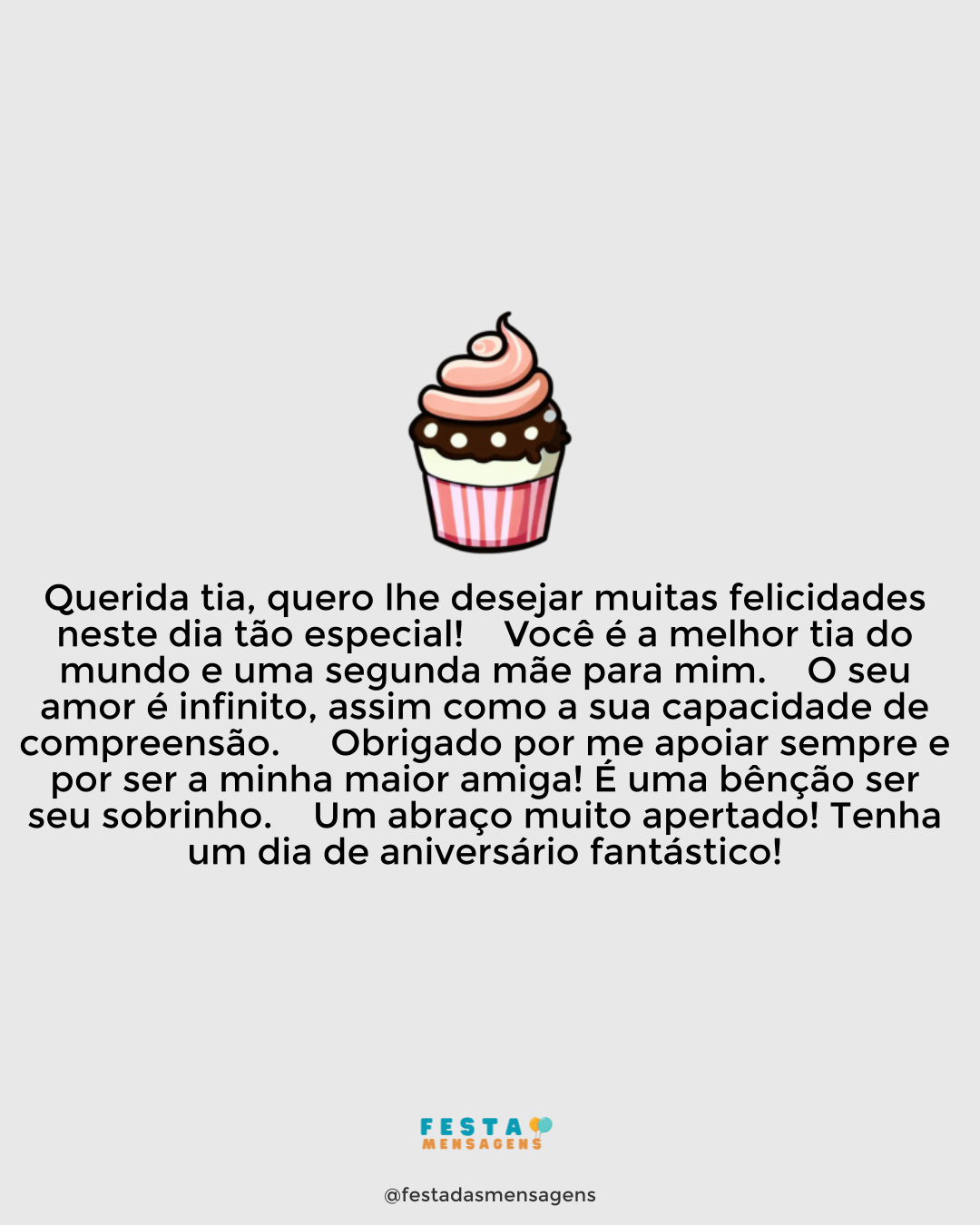 Meu muito querido e amado afilhado e sobrinho, é com muita felicidade que vejo chegar mais um aniversário da pessoa que mais adoro neste mundo. Só posso dar graças a Deus por me ter dado um afilhado e sobrinho tão adorável. Os meus votos no seu aniversário são que tenha sempre muita saúde e alegria na sua vida. Tenha um dia tão feliz quanto você me faz sentir. Feliz aniversário, meu querido!