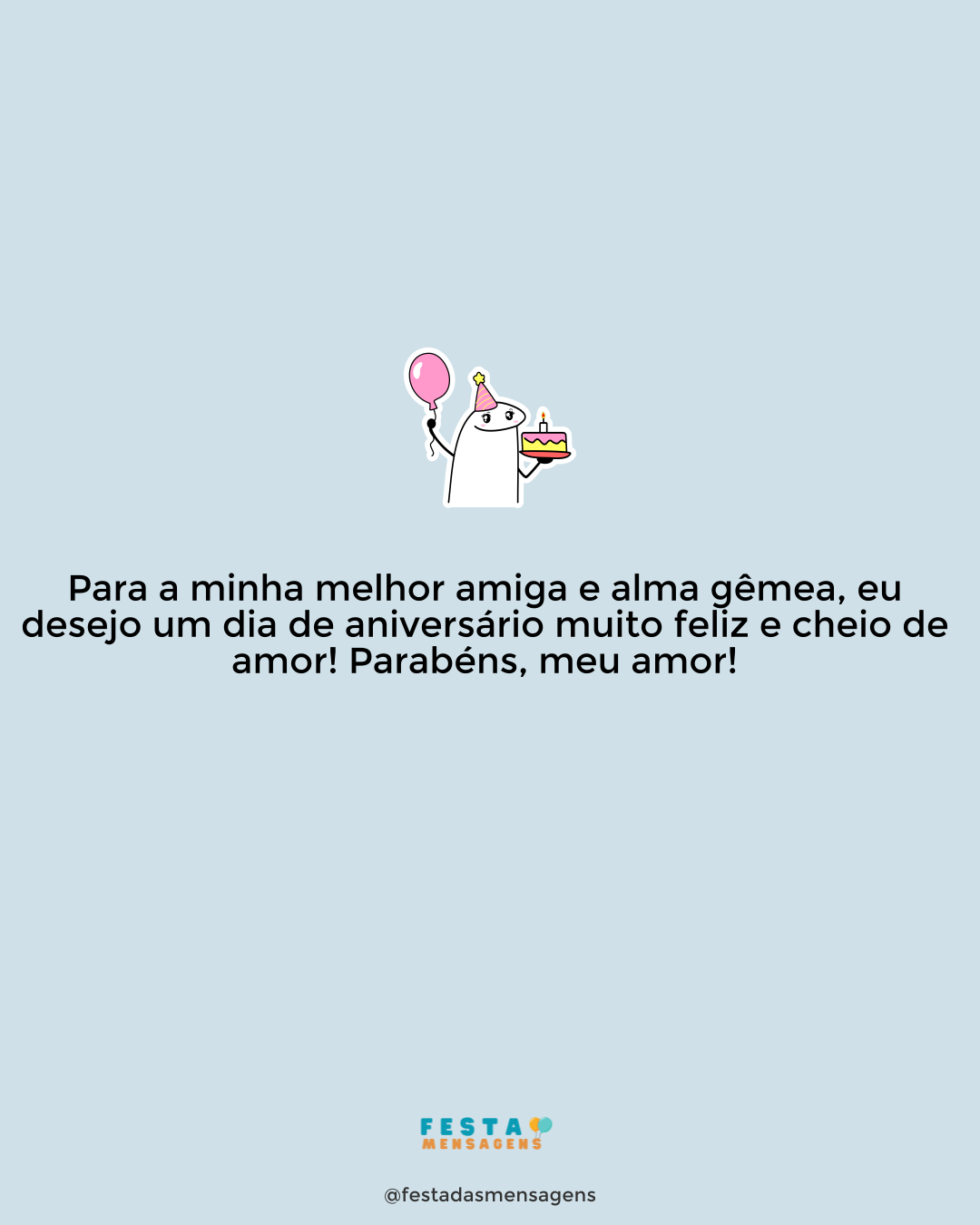 Você é a melhor amiga que alguém pode pedir ou desejar. No jardim da minha vida, você é flor mais bela e única. Sempre que eu precisei de ajuda, você esteve presente para me ajudar. Muitas pessoas me abandonaram quando eu precisei delas, mas você sempre lutou comigo. É por isso que o título de minha melhor amiga será sempre seu! Mesmo quando eu sou injusta com você, mesmo assim você fica do meu lado. O que seria de mim sem os seus conselhos e sem a sua direção? Talvez não estivesse aqui hoje! Você tem a minha amizade e lealdade eterna, e quando precisar de mim, nem precisa esperar, porque já estarei segurando a sua mão! Feliz aniversário para você, linda!