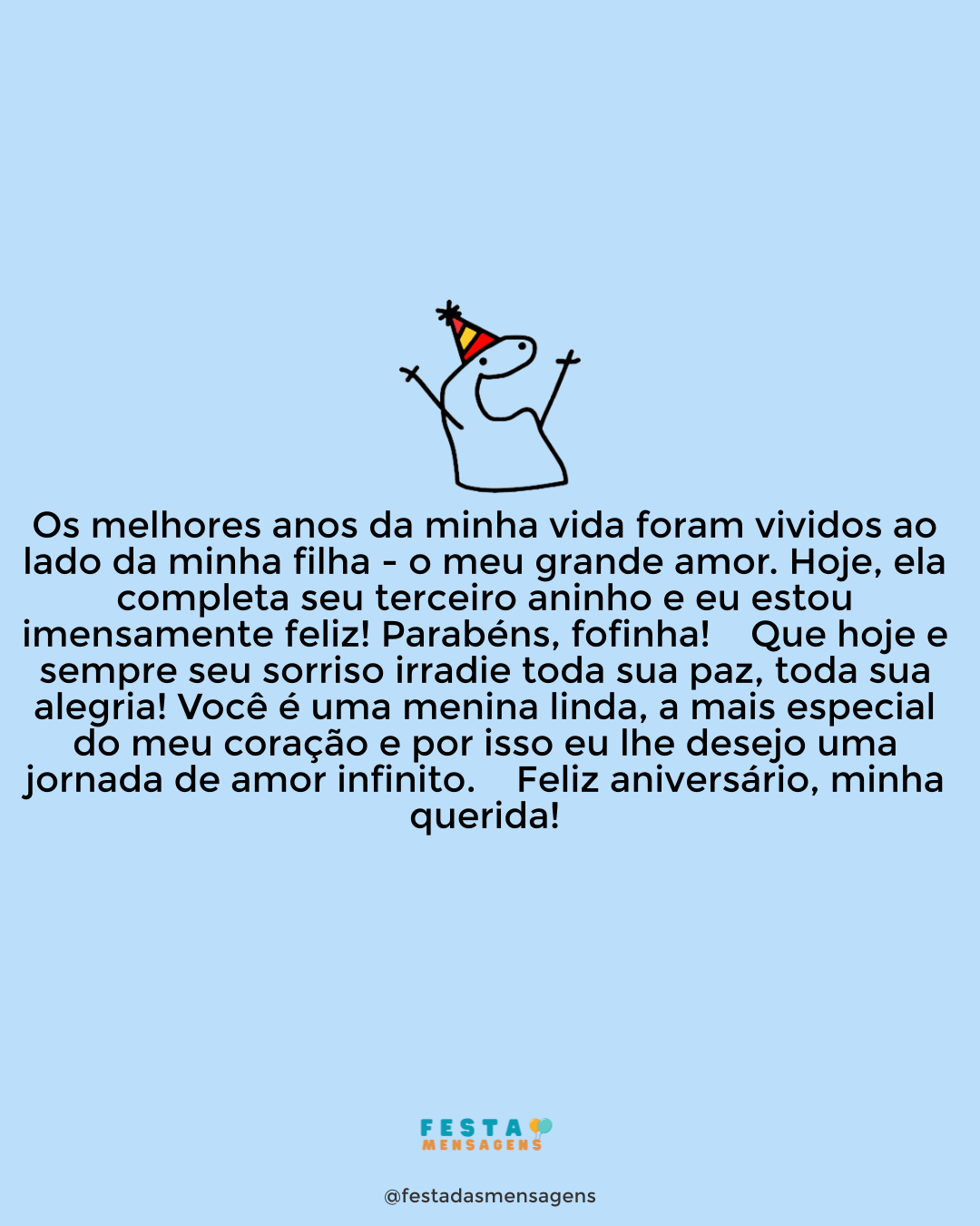 Ainda lembro quando você nasceu, puseram você no meu peito e eu te embalei pela primeira vez com a minha respiração. Nunca vou esquecer do dia em que você disse "mamãe" pela primeira vez, e fez com que os meus olhos brilhassem com tanta alegria! Quando você disse que me amava pela primeira vez, foi como receber de presente um coração novo, que batia com ainda mais força. São tantos os momentos inesquecíveis, como o primeiro dia de escola, o primeiro desgosto amoroso, as primeiras vitórias que eu comemorei do teu lado. O tempo foi passando, você foi crescendo e eu tive o privilégio de acompanhar cada passo importante da tua evolução. Uma bebê linda se transformou em uma menina carinhosa e depois em uma mulher maravilhosa. Que você mantenham bem vivo o desejo de vencer e conquistar todos os teus sonhos, e que possa manter esse brilho especial nos olhos que encanta todo o mundo! Nunca é tarde para mudar e melhorar, mas também é importante manter as características bonitas da infância! Parabéns por mais um ano, minha filha linda!