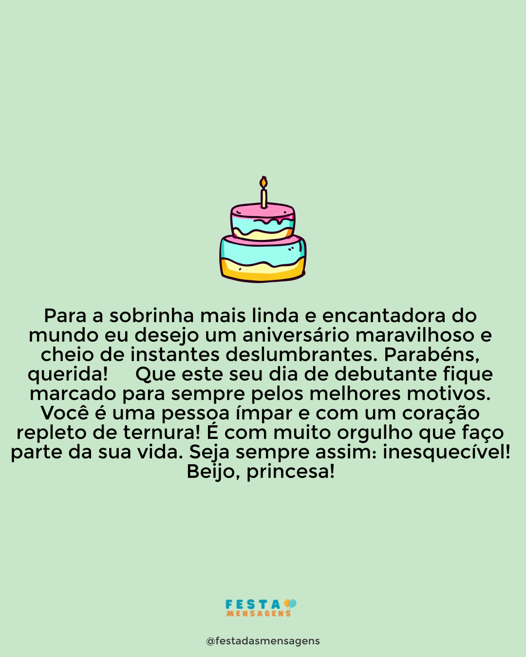 Eu gosto tanto de você, filha, que nem consigo sequer explicar de onde vem todo este meu amor! Hoje, você completa seu décimo terceiro ano e eu estou incrivelmente feliz por estar ao seu lado. Parabéns, querida! Saiba que a adoro do fundo do meu coração e todos os dias torço para que todos seus sonhos de menina se tornem realidade. Nunca desista de correr atrás nem de acreditar que tudo é possível de acontecer. Espero que goste da festa que preparamos e também dos presentinhos que compramos. Você é minha luz, a inspiração maior da minha vida e o motivo de toda minha alegria. Feliz aniversário, filha!