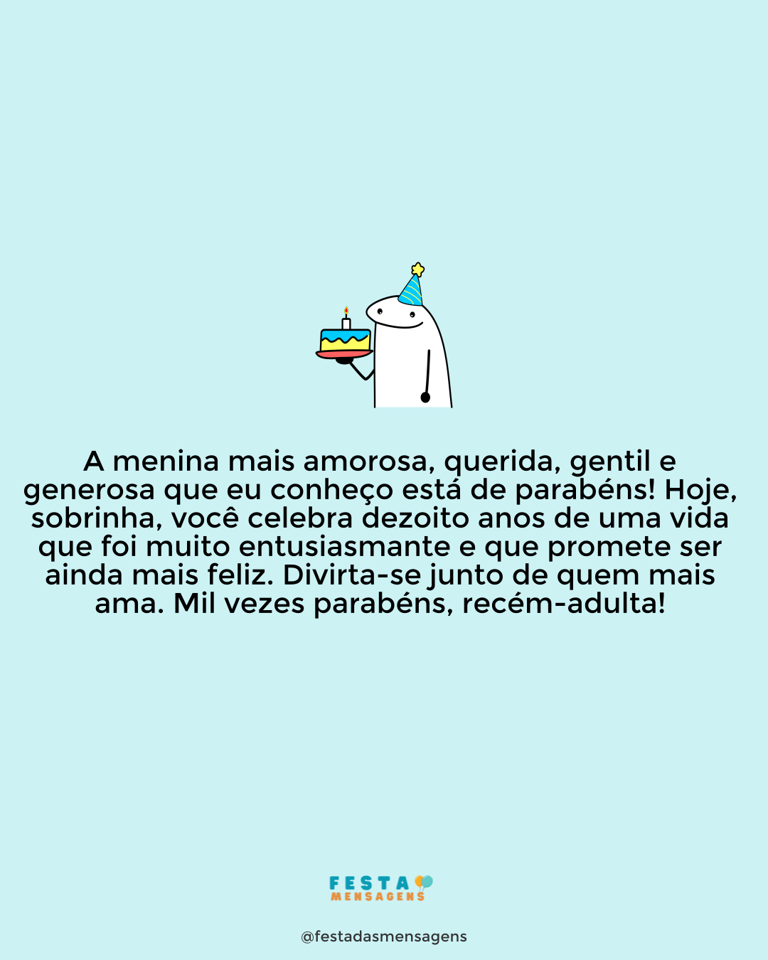 Nem acredito que minha priminha completa hoje 15 anos, pois ainda há pouco tempo nos divertíamos com brincadeiras de criança. Mas o tempo passa para todo mundo, e com você não seria diferente. Aquele dia tão esperado chegou e tudo que antes era expectativa será transformado em vários momentos de felicidade. Hoje, além de você, teremos como protagonista a alegria, que contagiará a todos que estiverem por perto com muitos sorrisos lhe proporcionando ótimas companhias. Saiba que estarei sempre por perto torcendo para que tudo na sua vida dê sempre certo, mesmo que o certo não seja aquilo que escolhemos. Que as responsabilidades desta nova etapa cheguem bem lentamente, lhe dando todo tempo necessário para que as novas descobertas se tornem algo inerente. Aproveite o seu dia com toda a energia que tem aí dentro, que o seu coração fique repleto de felicidade e que tudo aquilo que desejou para hoje de torne realidade. Despeça-se da infância em grande estilo, deixando os momentos de criança no passado, e recebendo a maturidade de braços abertos. Feliz aniversário de 15 anos, prima!