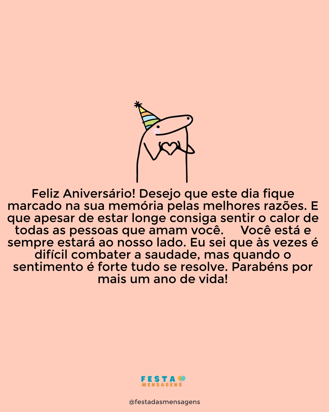 Embora a distância não separe dois corações, eu queria estar aí especialmente no seu aniversário, para compartilhar esse dia com você. Conversar tranquilamente, ouvir as novidades, ver você sorrindo alegremente. Mas como não é possível estar ao seu lado nesta ocasião vou comemorar o seu dia com você mas bem aqui no meu coração. Desejo também que hoje você ouça as palavras que sempre quis ouvir. Sinta a emoção que sempre esperou sentir. Caminhe pelos trilhos que um dia desejou seguir. Divida o carinho com quem sempre desejou repartir. Abrace todos os amigos que sempre desejou reunir, e viva a vida que sempre sonhou viver. Parabéns e muitas felicidades, querida! Feliz Aniversário!