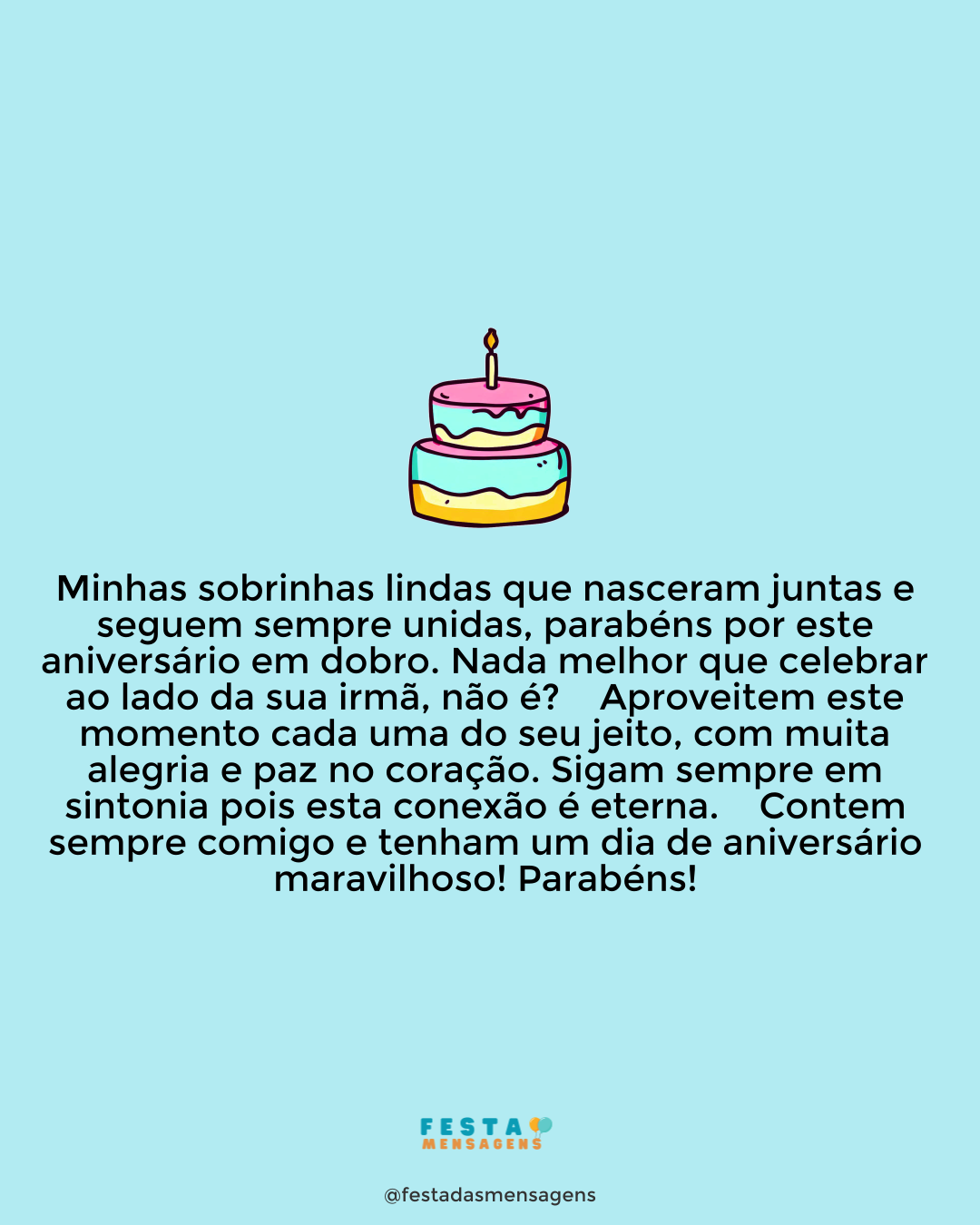 Às vezes temos sorte de encontrar pessoas que amaremos para sempre. Você é esse caso, titia de consideração! Podemos não compartilhar o mesmo sangue mas teremos sempre a ligação do coração. Tenha um aniversário muito feliz! Você será sempre aquela pessoa especial que, aconteça o que acontecer, estará junto, longe ou perto. É uma coisa que não se explica, acontece e ponto. É por isso, tia, que eu quero lhe desejar uma jornada simplesmente maravilhosa igual nossa união.