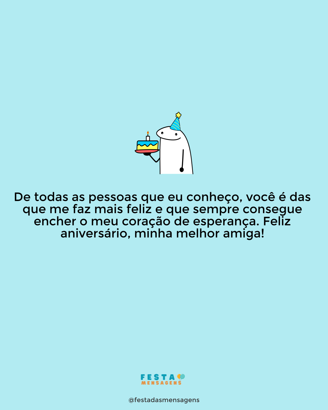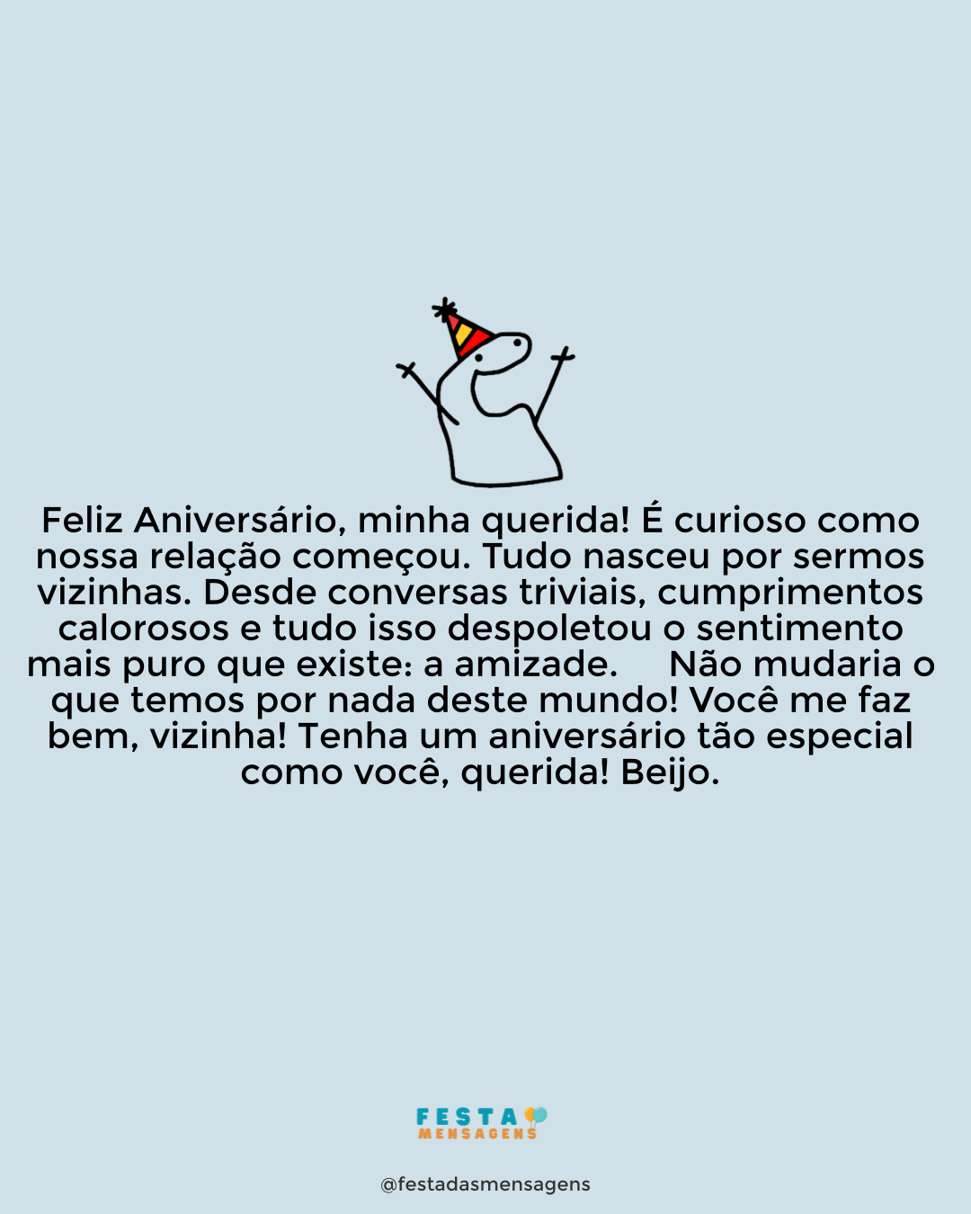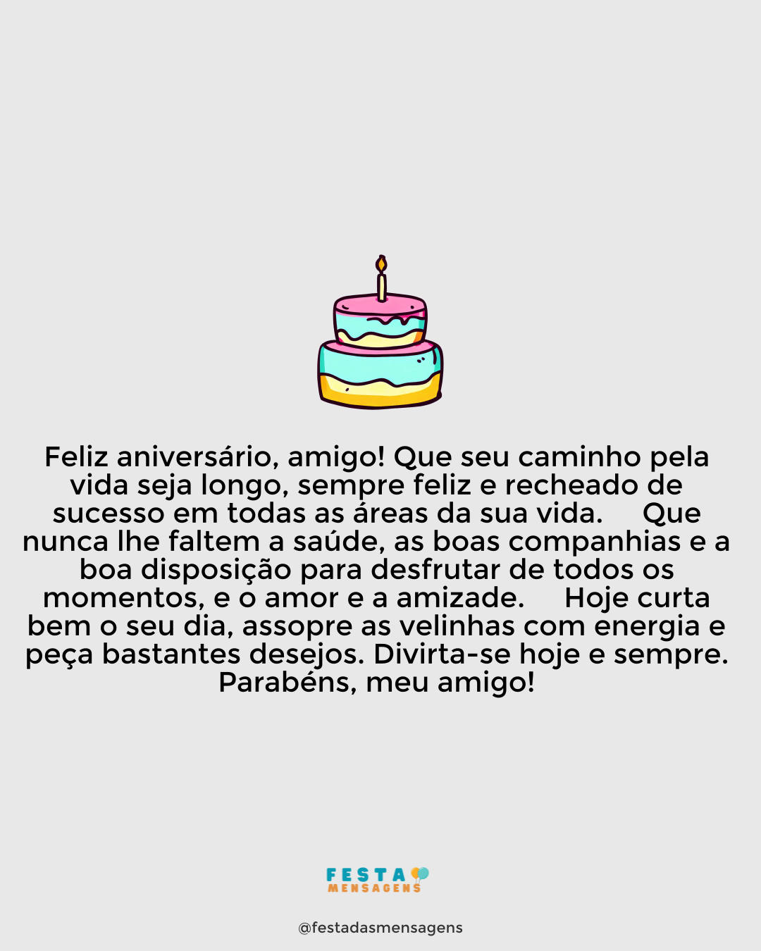 Parabéns por esta data especial, amiga! Que o tempo seja sempre o seu melhor parceiro, trazendo serenidade, equilíbrio e sabedoria – que lhe darão a receita ideal de como viver a vida, aproveitando o melhor que ela tem a oferecer. Que as conquistas do passado lhe tragam à lembrança, não só alegrias, mas também a força e o entusiasmo para superar eventuais obstáculos e implementar os mais importantes projetos para o futuro. Muita saúde, amor, paz, fé, esperança, alegrias e prosperidade! Um sincero abraço e votos de muitas felicidades da tua amiga que, apesar de distante, nunca te esquece!