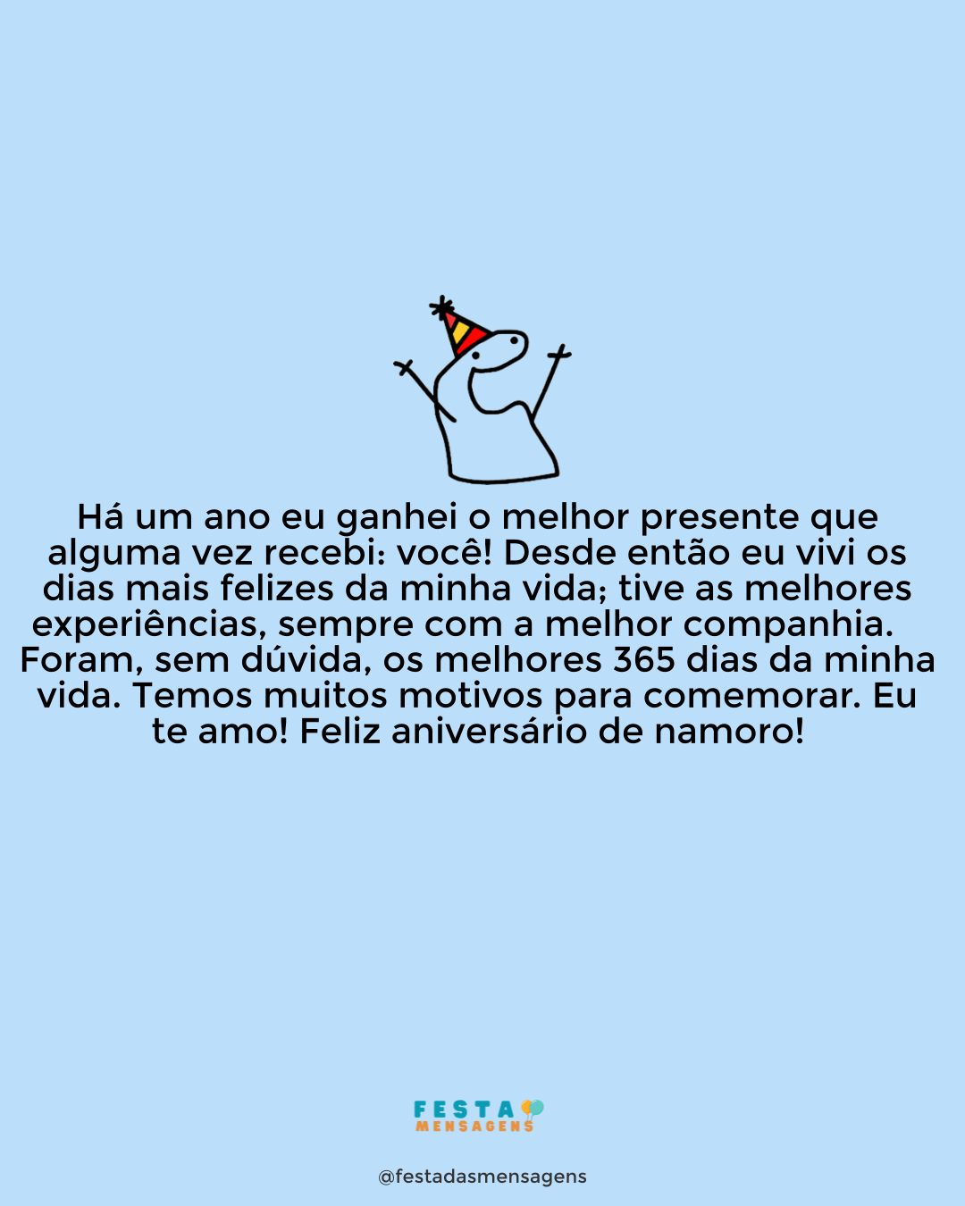 Sou tão feliz ao seu lado que às vezes parece mentira que já namoramos há dois anos. Parabéns para nós dois! Que a vida e o amor estejam sempre em sintonia com nosso coração.