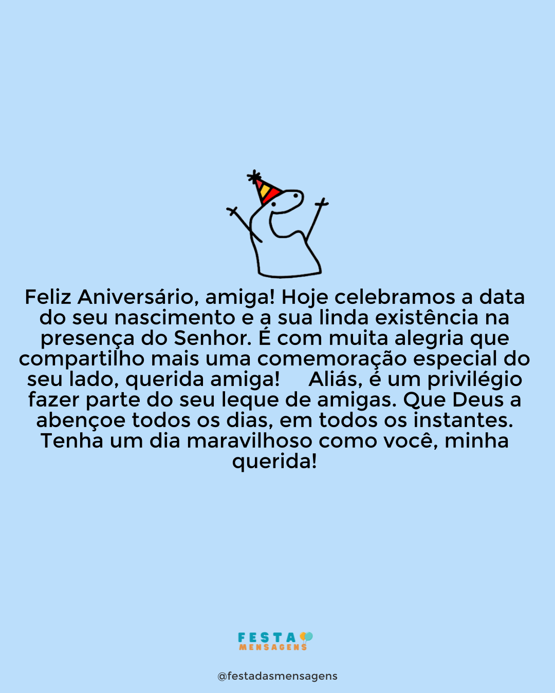 Hoje é o seu aniversário. Cada dia que vivemos é um agradecimento a mais, por tudo o que recebemos do Senhor. Querido irmão, eu oro para que tenha uma vida longa para ser vivida e que o Senhor seja um mestre a guiar seus passos para o bem, e para o amor a todos que o cercam. Ouça com atenção a palavra da verdade e da salvação, somente ela pode nos trazer a felicidade. Jamais afaste Deus do seu coração, pois Ele é o nosso verdadeiro e único caminho. Feliz aniversário, meu irmão, na paz de Cristo!