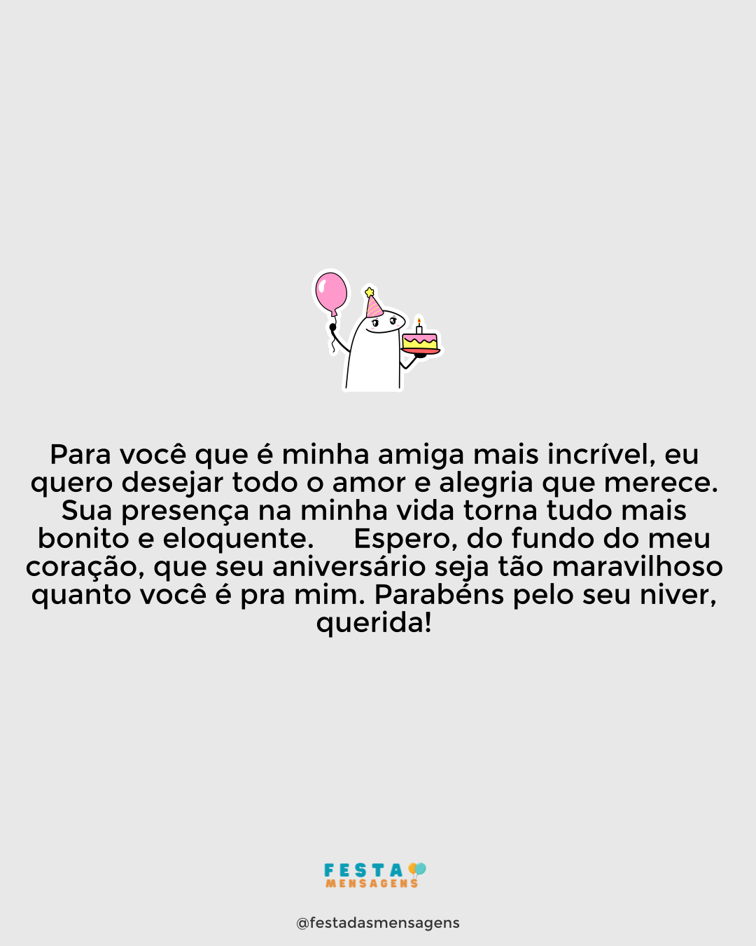 Melhor amiga, melhor parceira, companhia para todas as horas, que seu aniversário esteja a altura da pessoa incrível que você é. Parabéns! ✨