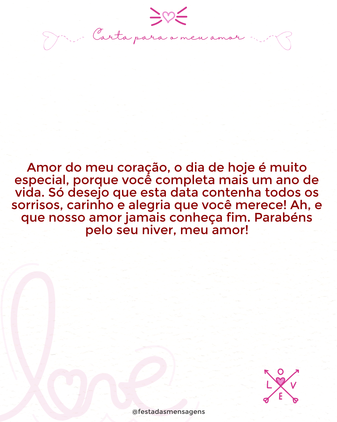 Meu amor, como eu adoro celebrar seu aniversário! Você vai ter uma grande festa! Parabéns!