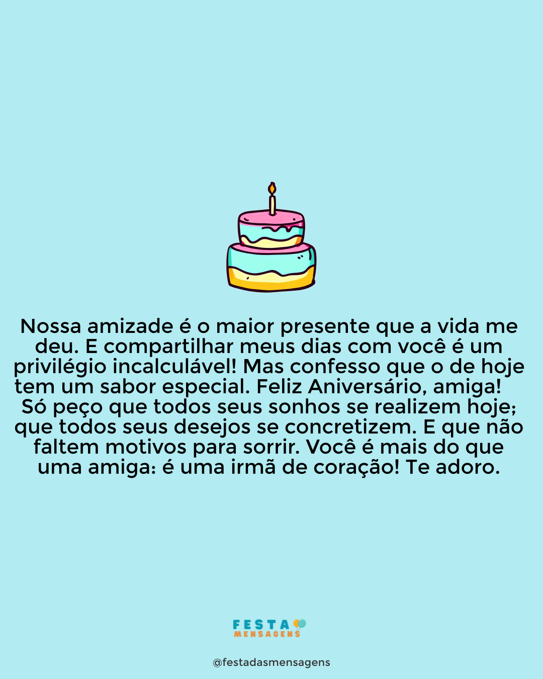 Hoje é um dia muito especial! Parabéns! Quero que saiba quanto você é importante por mim. Saiba que sua luz ilumina caminhos, seu sorriso aquece corações, e sua presença torna qualquer momento ainda mais especial. Desejo que Deus lhe conceda paz, saúde e muitas alegrias, e que essa nova fase traga ainda mais motivos para sorrir. Que todos seus sonhos se realizem e a felicidade sempre seja sua fiel companheira. Feliz aniversário!