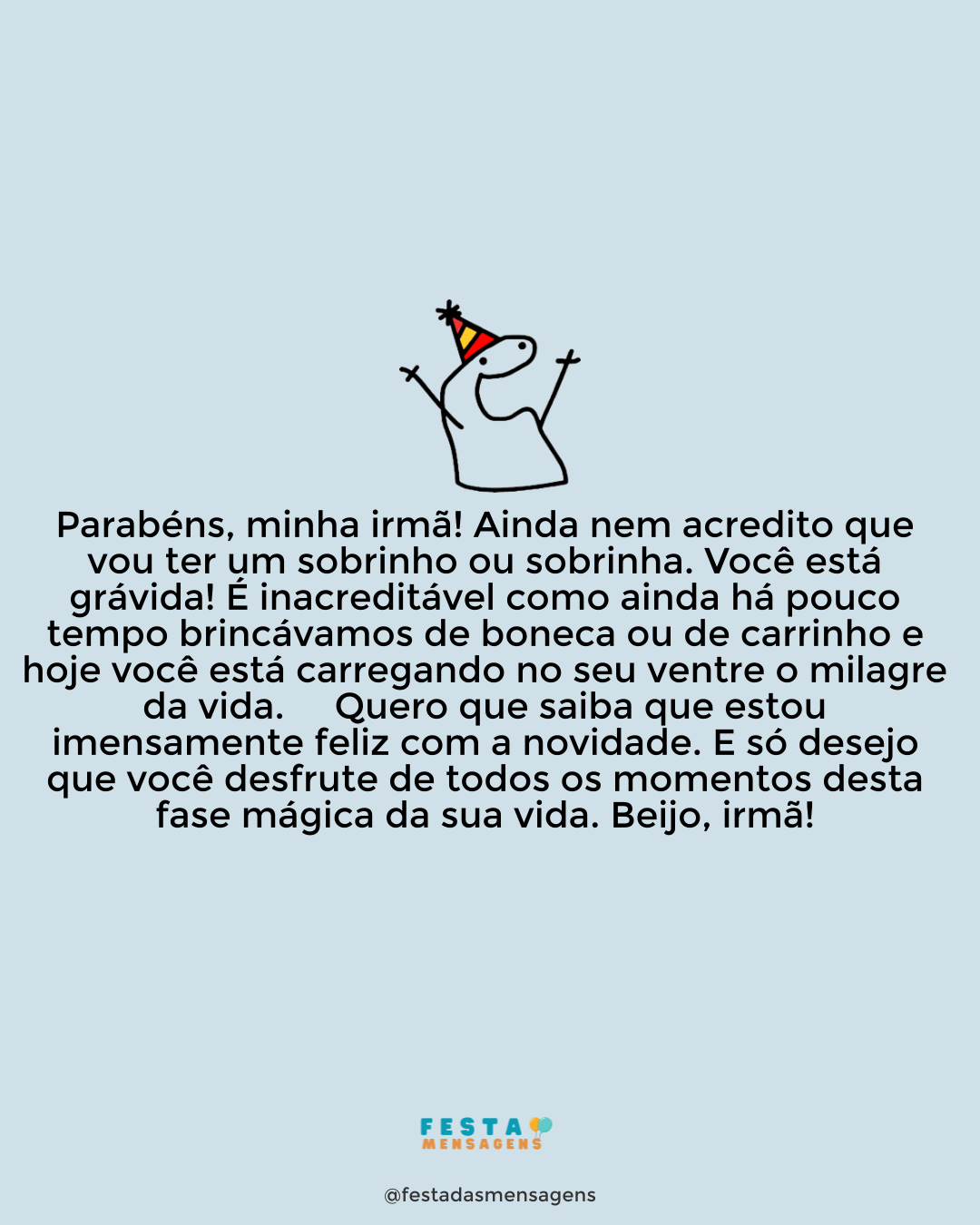 Parabéns, prima! Você foi abençoada com a dádiva da gravidez. Deus foi muito generoso com você! Só espero que esta seja uma experiência linda e emocionante, porque dar vida é conhecer o rosto da felicidade. Não vejo a hora de conhecer esse bebê tão aguardado. Desfrute de todos os momentos e encare todas as situações com um sorriso no rosto e com a esperança no coração. Você será uma mãe encantadora. Beijo.