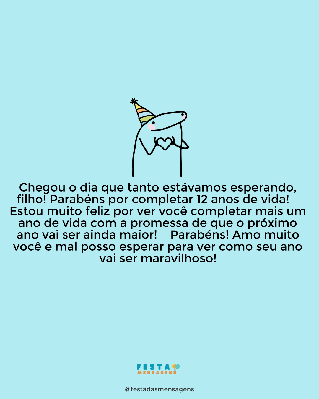 Você, que chega agora aos 12 anos, sempre tem alcançado sucesso na escola. É um grande exemplo para seus parentes, com suas demonstrações de valentia e sabedoria para com seus amigos e colegas. Com essas poucas palavras vou traduzir toda a admiração e orgulho que sinto pelo meu filho querido. Não fique preocupado com as nossas discussões, você sabe que eu como pai por vezes sou severo e, às vezes, intransigente. Apesar disso, você pode ter a certeza de que só sei sentir amor por você. Estaremos sempre juntos esteja onde estiver. Desejo boa sorte e todo o sucesso para o que você sonha alcançar. Que todas as suas aspirações se convertam em realidade, esse é o desejo do seu pai e de todos os seus amigos e parentes, no dia do seu aniversário. Queria poder dizer muito mais, mas as palavras faltam nos momentos de muita emoção. Por isso estamos, eu e sua mãe, a desejar tudo de bom para você. Fica sempre com Deus, meu filho! Aceite aquele abraço do papai.