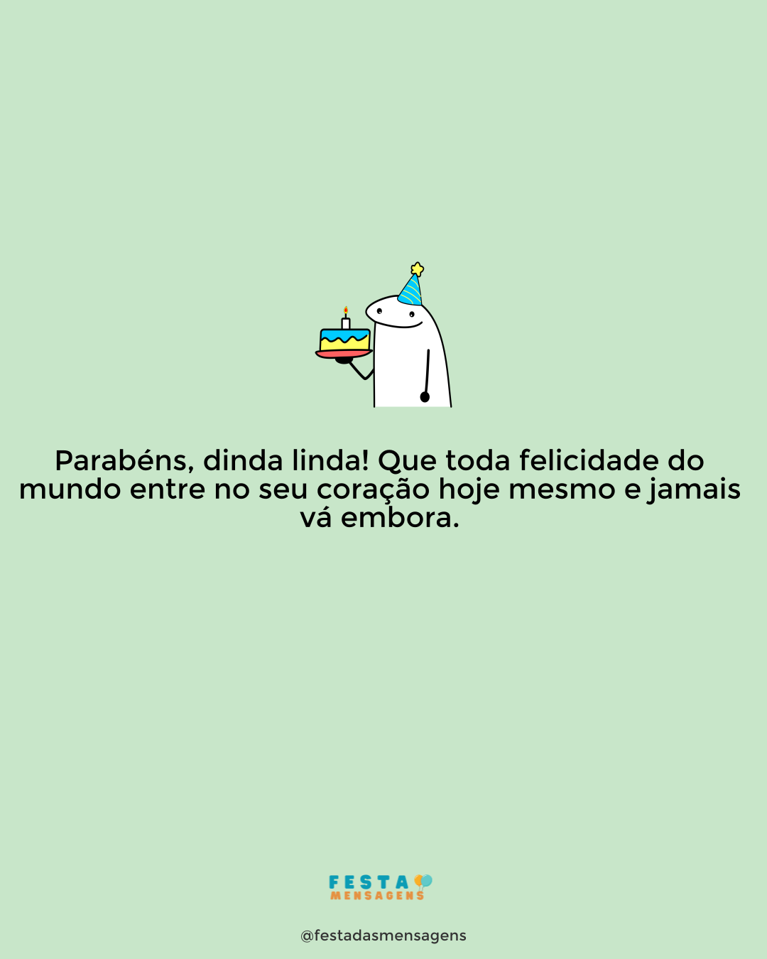Parabéns, minha querida prima e comadre! É com grande felicidade que celebramos mais um ano da sua vida! Você é, sem sombra de dúvida, a melhor prima e a melhor comadre que podia ter. A nossa infância foi maravilhosa e hoje já não conseguiria imaginar a minha vida sem você por perto. Tenha um feliz aniversário, minha querida prima e madrinha do meu filho!