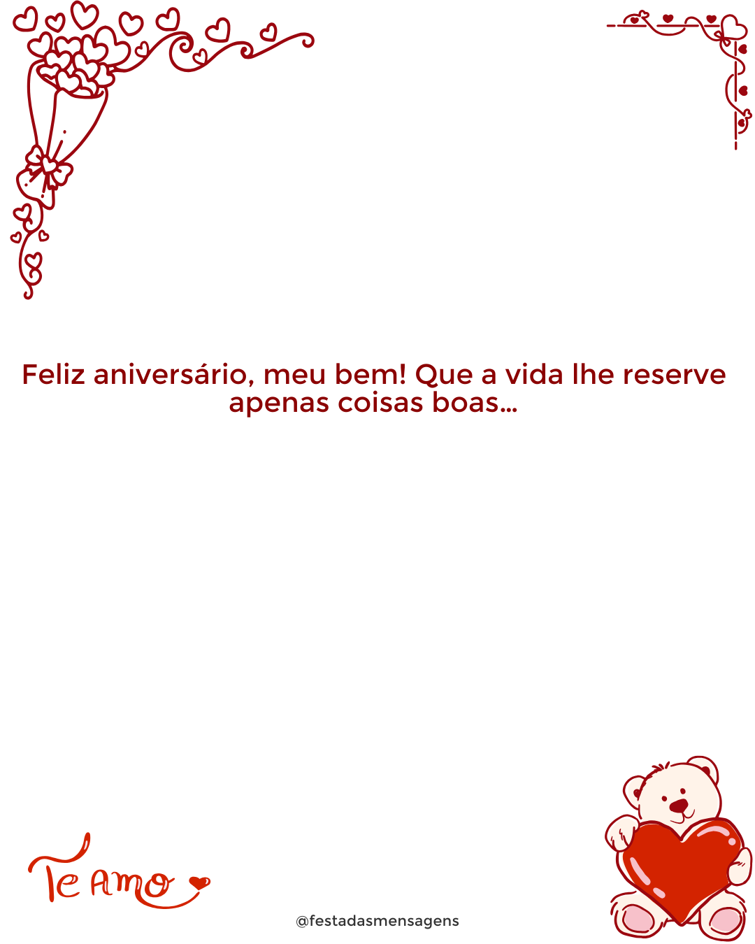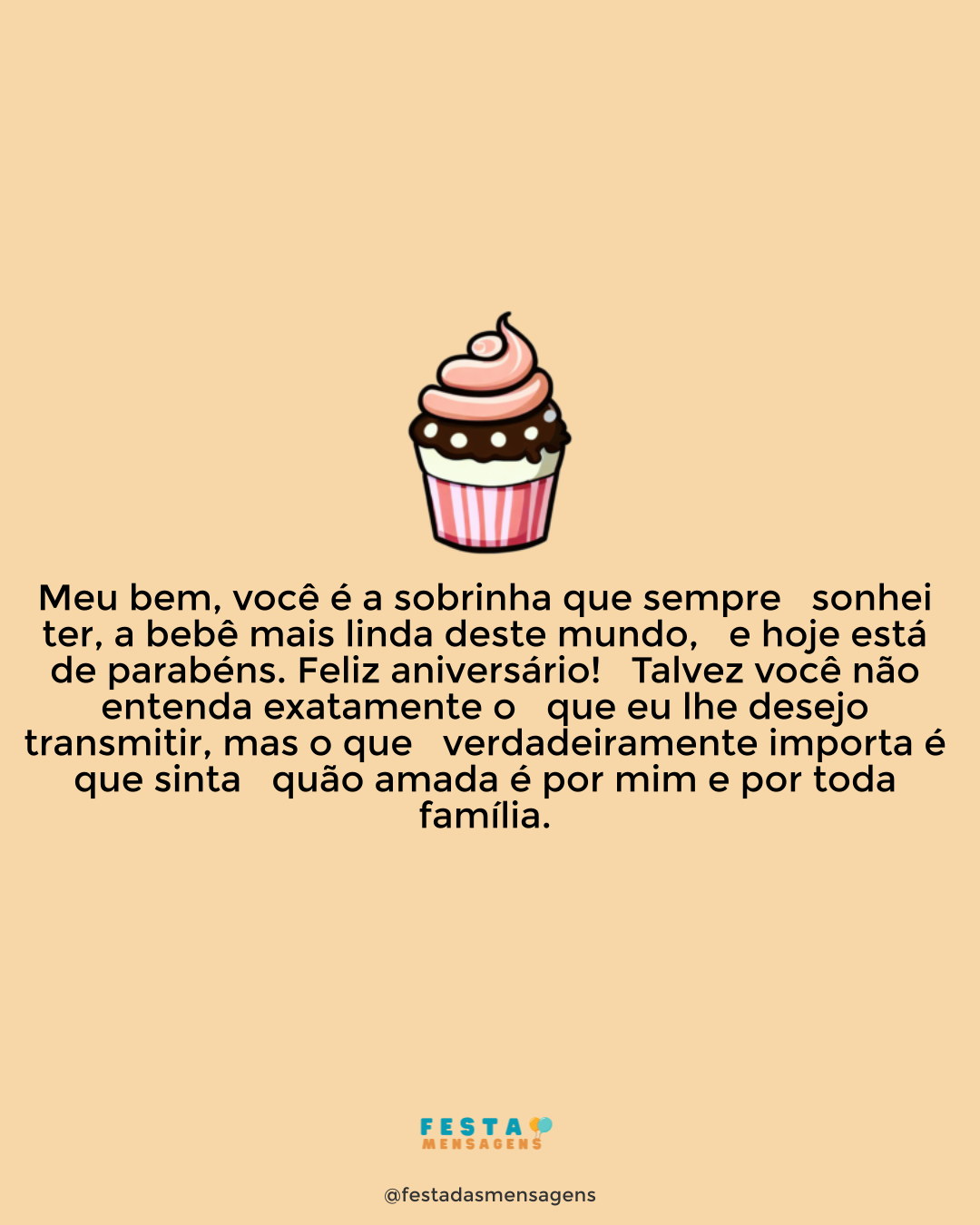 Minha filha querida, o tempo passou e você deixou de ser a minha menininha e tornou-se uma mulher, linda e independente. Eu sei que em alguns momentos discordamos de algumas coisas e até brigamos, mas quero que você saiba que eu respeito as suas vontades, pois sei que é responsável e inteligente e sabe o que é melhor para você. Não quero ter você ao meu lado infeliz, quero que siga a sua vida como achar melhor e que seja feliz, afinal é para buscar a felicidade que estamos aqui. Eu desejo que o dia do seu aniversário esteja sendo muito especial, que você tenha recebido muitos abraços de pessoas queridas e muitas energias positivas. De mim, receba todos os votos de saúde, amor, paz, sucesso e felicidade. Eu te amo, minha filha! Com todo o amor, da sua sempre mamãe.
