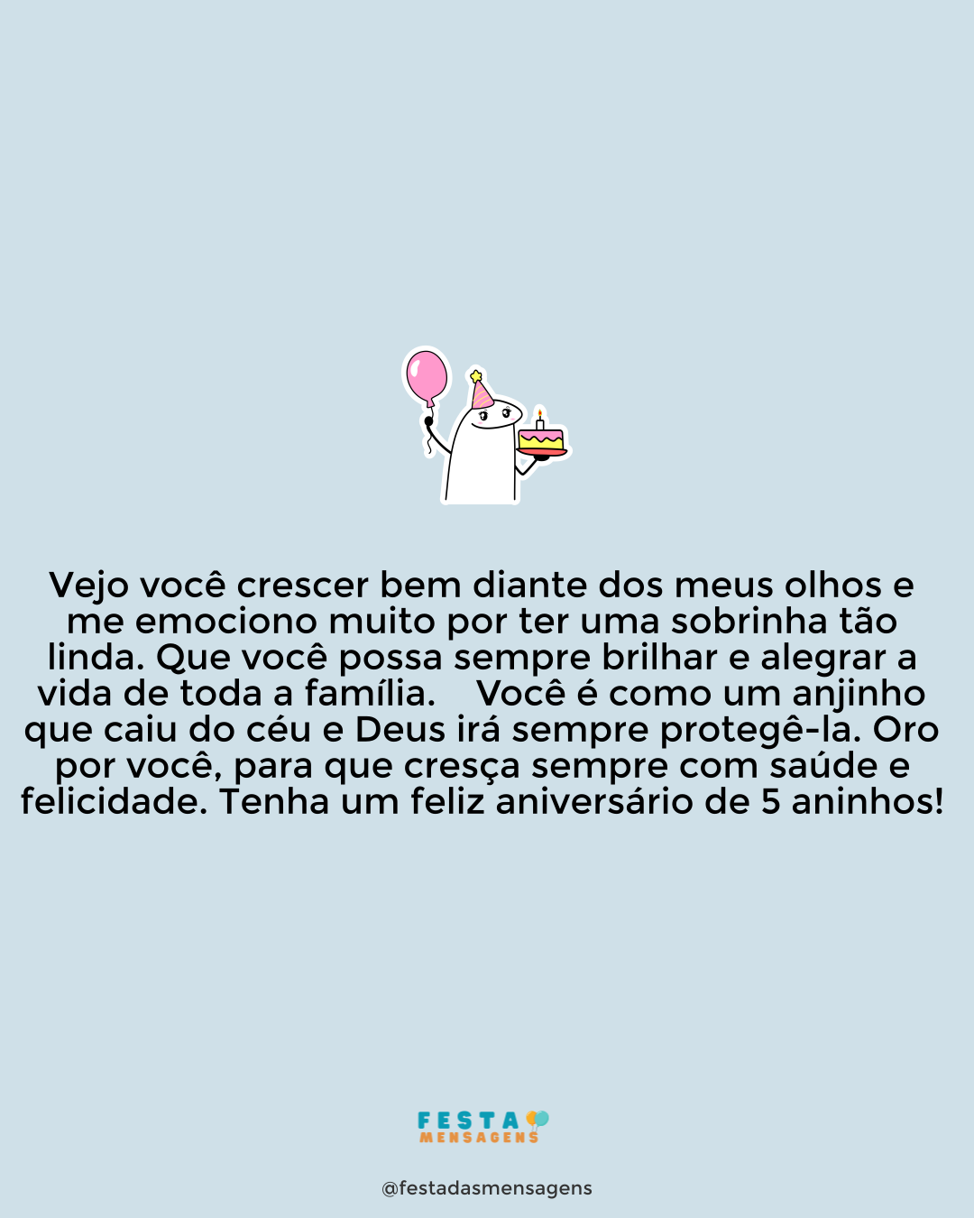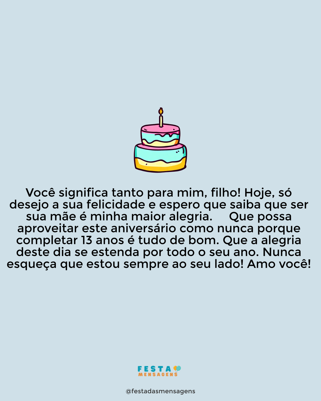 Hoje é o dia da minha princesa, da minha amada filha e da maior razão da minha alegria. Você está completando 13 anos de vida e eu transbordo emoção neste momento especial. Você em enche de orgulho, filha. Ver você crescer é minha maior alegria e a sua felicidade é minha missão. Estarei sempre ao seu lado para fazer tudo que está ao meu alcance para vê-la feliz. Aproveite este dia como nunca. Curta cada sorriso, cada abraço, cada presente especial e acima de tudo, seja exatamente como você é, porque é uma menina incrível! Feliz aniversário!