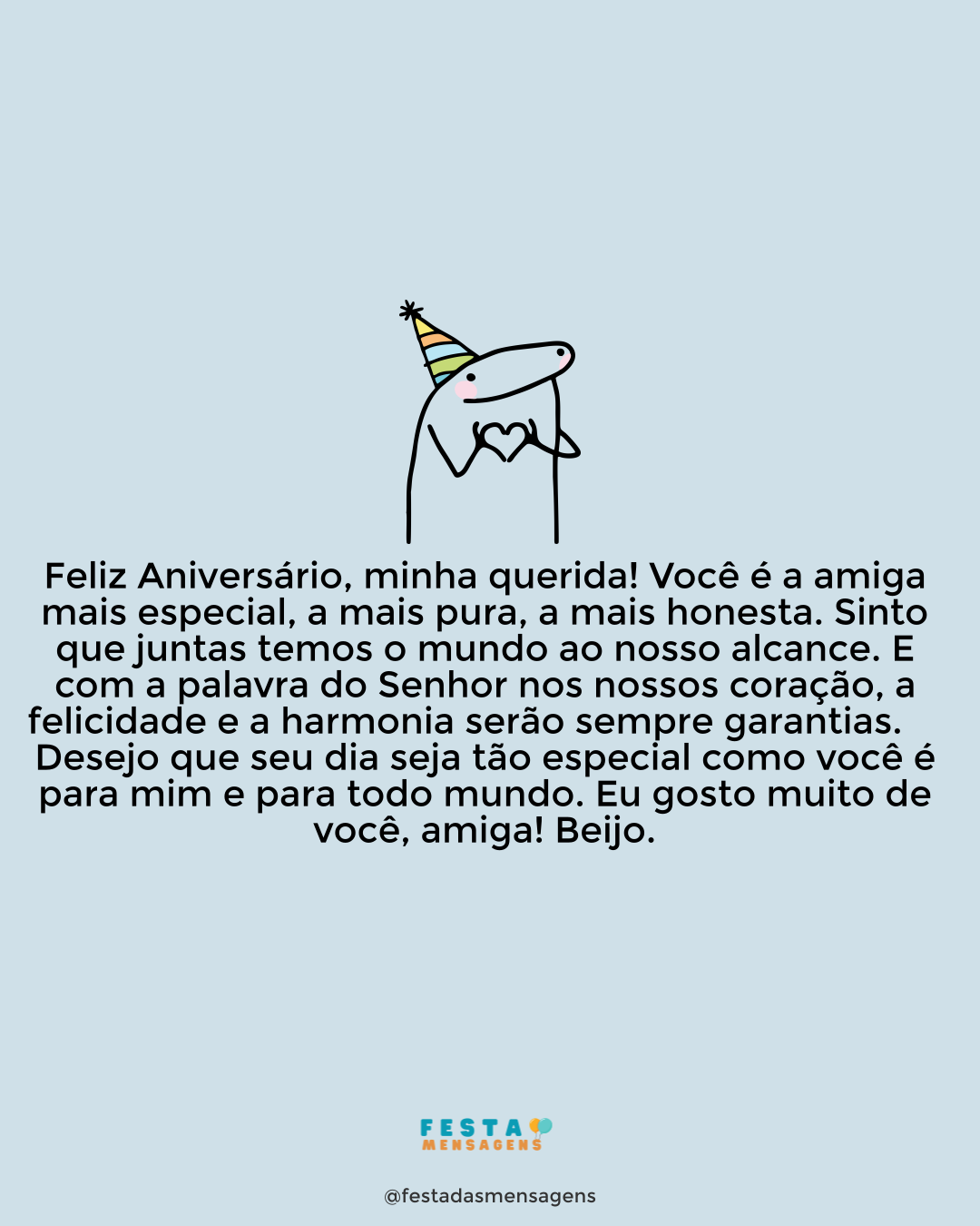 Estou feliz, muito feliz porque você existe, porque você tem uma vida inteira para conquistar a cada dia. Parabéns por você ser tão especial, por ser a minha melhor amiga, por ter um sorriso para ofertar a quem precisa e por estar sempre de bem com a vida! Feliz aniversário! Abra os braços e abrace este dia especial que é só seu. E no qual nós insistimos em participar, levando nosso abraço e nosso carinho, e os nossos votos de muitas felicidades! Continue assim, sempre alegre, sempre bem disposta sempre feliz, e mesmo que a dor invada sua alma, o nosso desejo é que sempre possa encontrar a verdadeira felicidade. Parabéns, minha querida amiga!