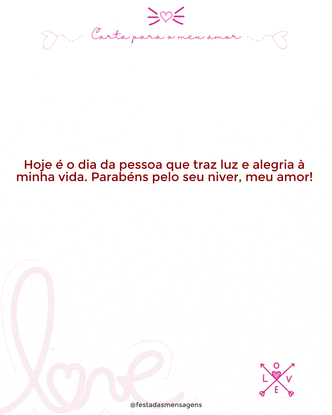 Feliz aniversário, marido! Mais uma vez estamos juntos comemorando mais um ano de vida seu repleto de carinho e muito amor. Nossa vida já deu muitas voltas e você sabe bem como já tivemos que enfrentar muitos desafios, mas com a graça de Deus e nossos esforços e união, vencemos tudo e no fim saímos mais fortes ainda. Hoje celebramos mais uma no seu, com a certeza de que nada nos impedirá de viver a vida que merecemos e que juntos conquistaremos. Te amo muito e desejo um lindo dia! Felicidades, amor!