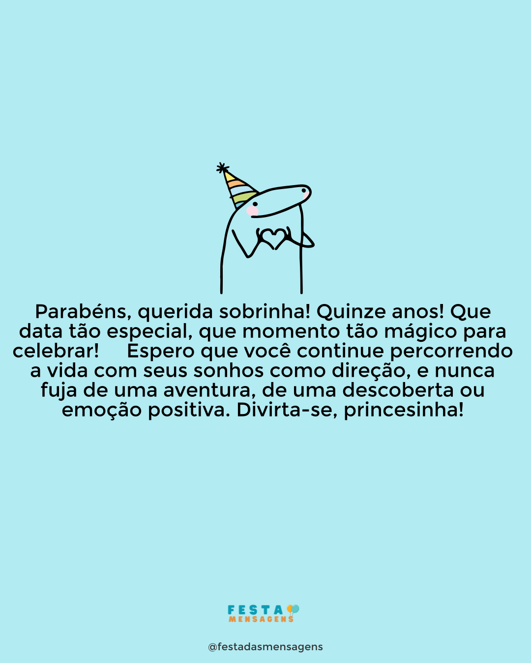 Feliz Aniversário, minha querida! Você não é minha filha, mas é como se fosse. Tenho por você um amor inesgotável! Seria capaz de fazer qualquer coisa para ver você sorrir! É por isso que estou torcendo para que seu dia de debutante seja imensamente feliz, memorável até. Faça da sua entrada nos quinze anos um momento repleto de emoção e risada! Beijo, minha querida!