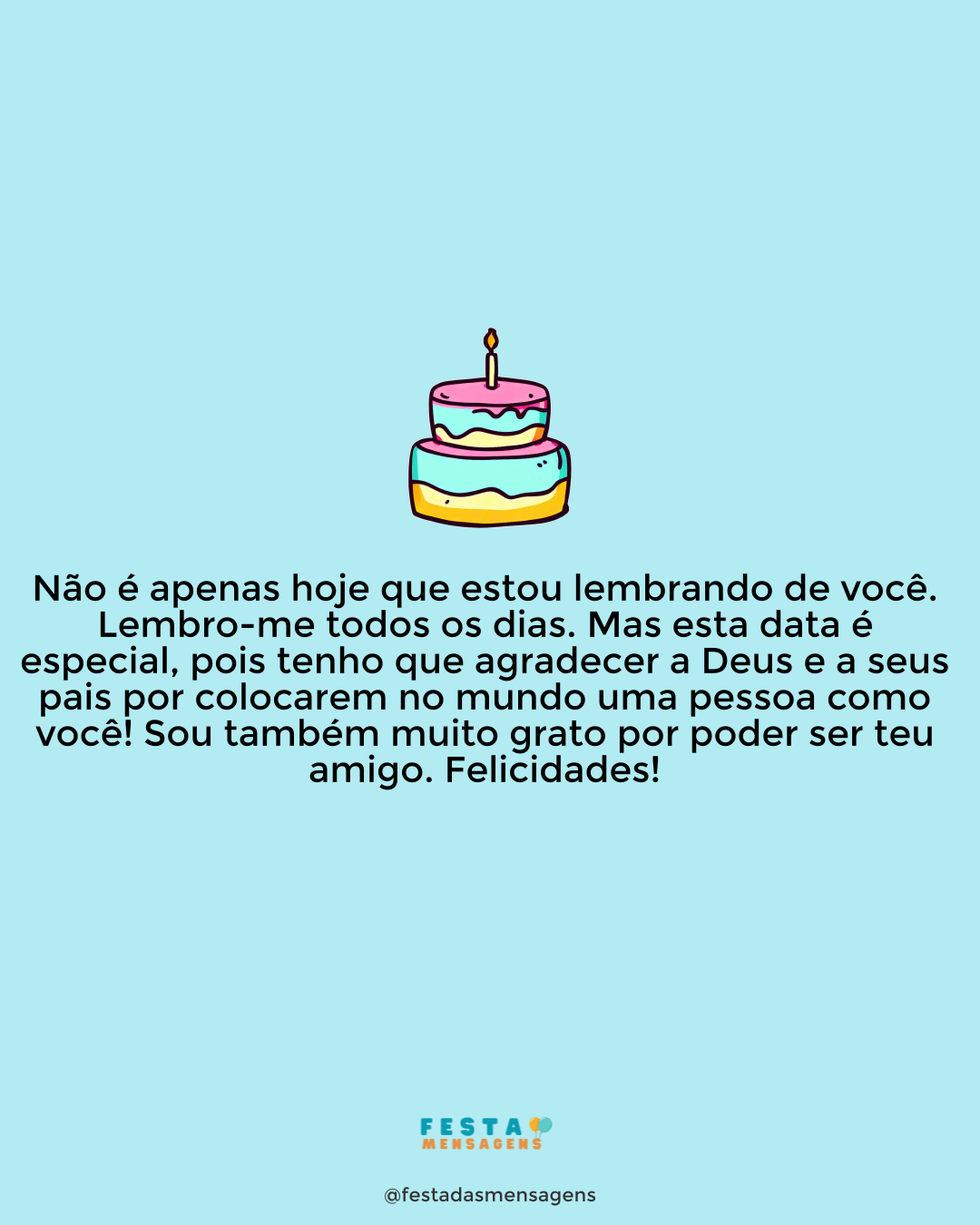 Você está de parabéns não só por ser uma pessoa muito querida e especial, mas também por completar mais um ano de vida. Feliz aniversário! Só gostaria que você estivesse mais perto para celebrarmos devidamente esta data! Infelizmente, a saudade é uma coisa terrível. Eu faria qualquer coisa para estar fisicamente ao seu lado nesta jornada que promete ser grandiosa, muito feliz e divertida! Mas acredite que mesmo à distância eu juro que estaremos perto, nem que seja em pensamento e coração. Você é uma pessoa incrível e merece tudo que existe maravilhoso na vida, por isso eu tenho certeza que este seu dia ficará para sempre guardado na sua memória. Parabéns por mais um ano espetacular!