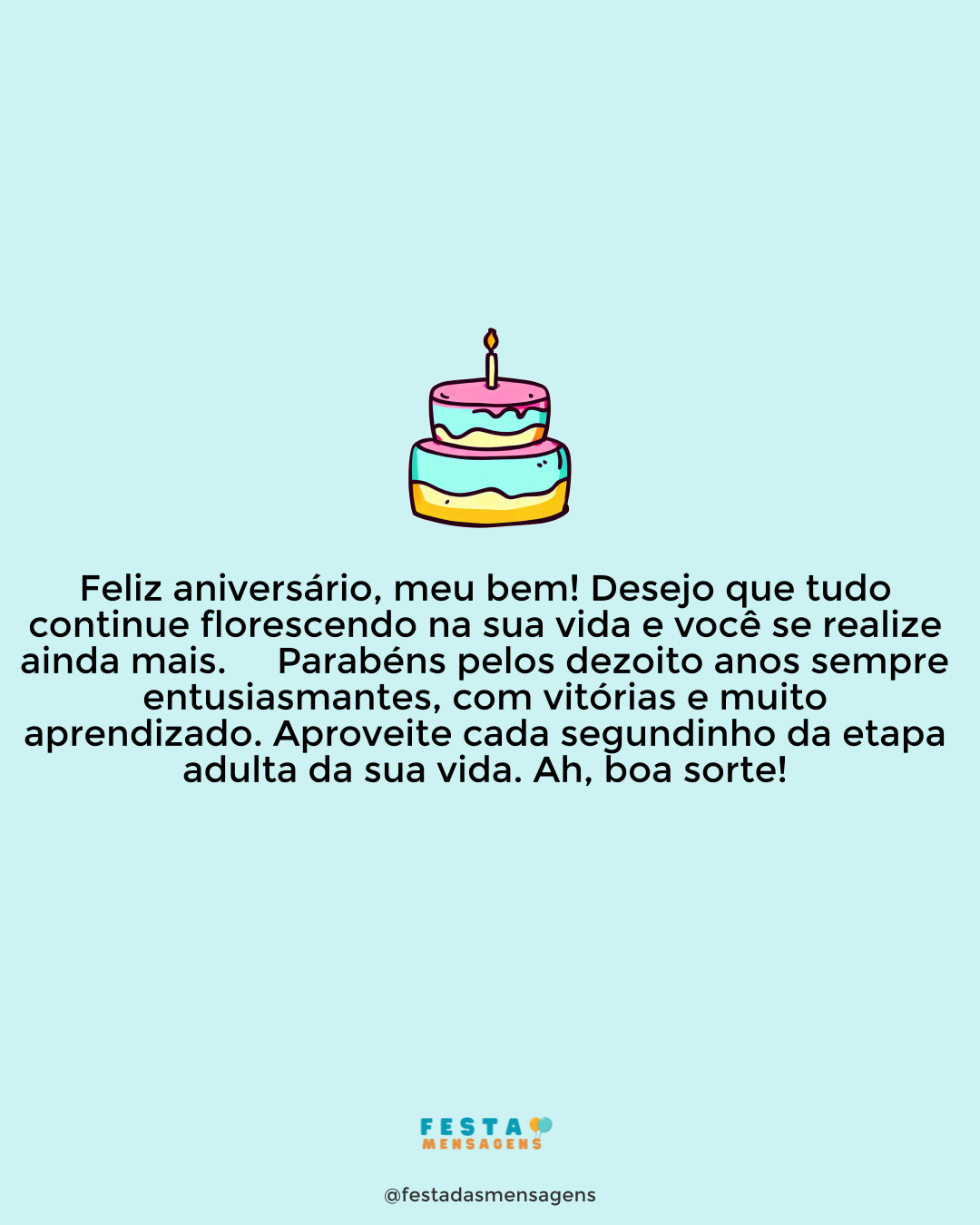Hoje você tem de ser feliz, mais feliz do que alguma vez foi. Sinta-se livre, em paz com o mundo e de costas voltadas para tudo que é cinzento. Tenha um dia lindo igual à etapa que está vivendo: a adolescência. Feliz Aniversário! Desejo que não faltem surpresas ao seu dia e que toda emoção seja positiva. Sorria muito, cante, dance, pule o mais alto que conseguir. Desenhe alegria na tela do mundo e feche a porta a tudo que não vem de bem. Parabéns por mais um ano de glórias, de conquistas e de superações. Você é um ser humano cada vez mais preparado para os desafios da vida. Tenho muito orgulho em você e em tudo aquilo que tem proporcionado a tudo e a todos.