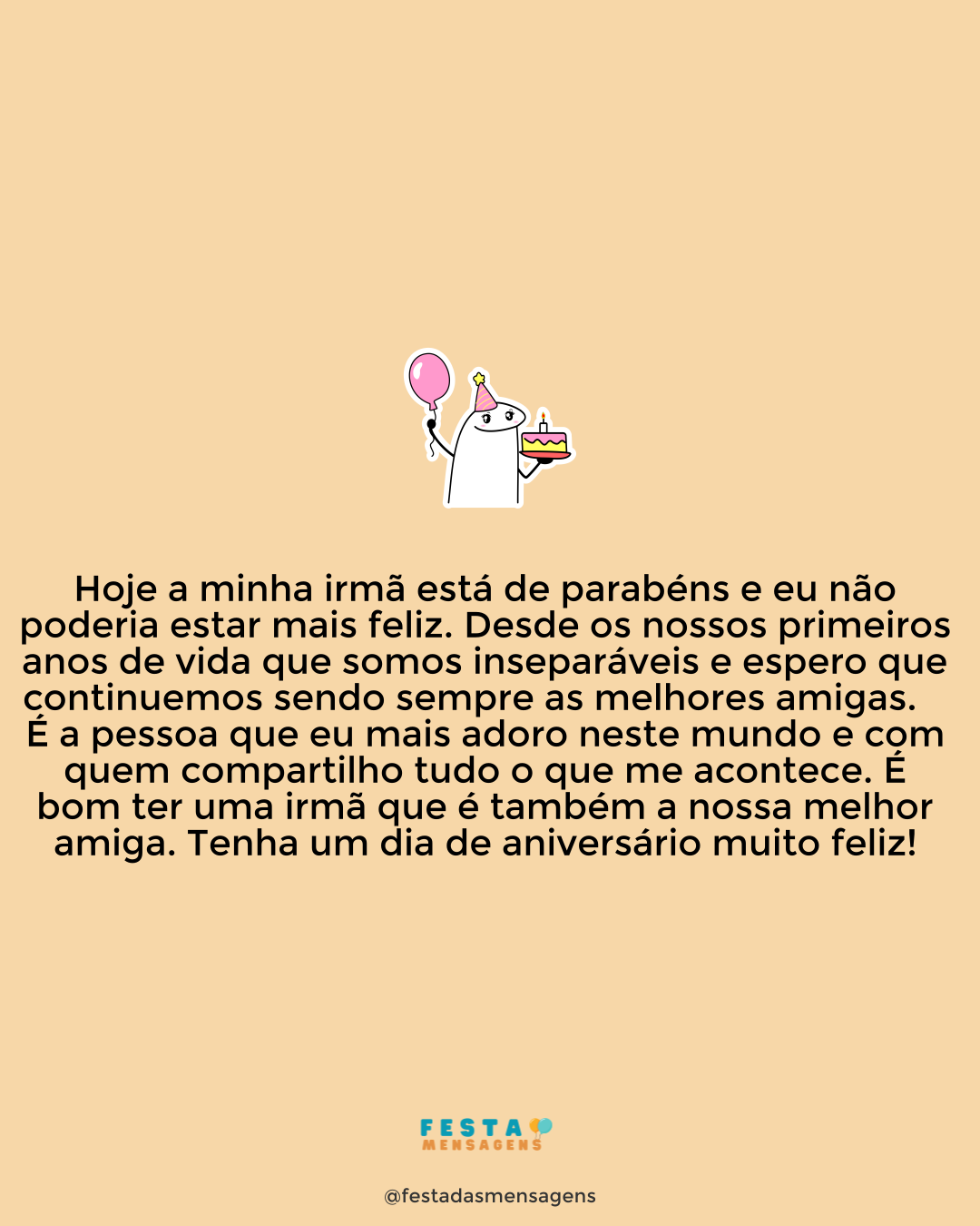 Parabéns, querida amiga! Eu sei que temos algo há pouco tempo, mas quando os sentimentos são vividos intensamente nada pode ser tão forte, poderoso e leve. Desejo que seu dia seja bom e repleto de belas sensações de prazer, alegria, amizade e muita saúde junto de quem sempre lhe fez bem e deu amor. Desejo que nenhum presente fique por abrir e em todos eles descubra a verdade mais linda do mundo: a amizade, respeito e a dádiva de celebrar mais um ano. Tenha um dia lindo, querida! Não desista de ser como é nem de lutar por tudo aquilo em que acredita e lembre-se que nunca estarei longe, mas sim perto para vivermos este dia e nossa amizade.